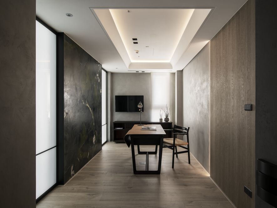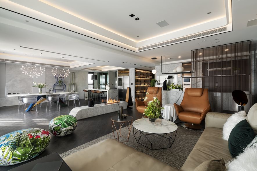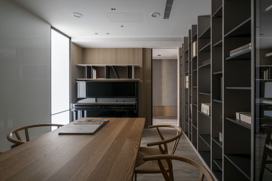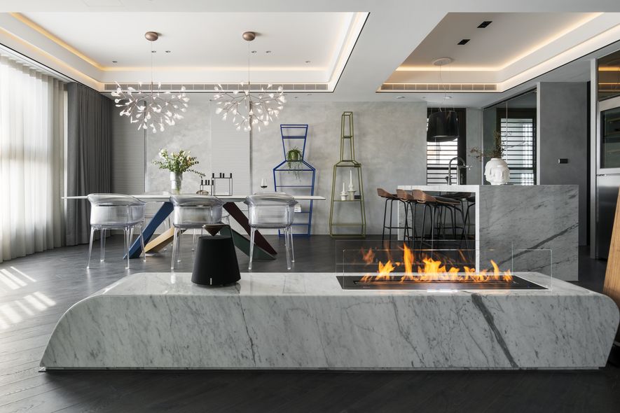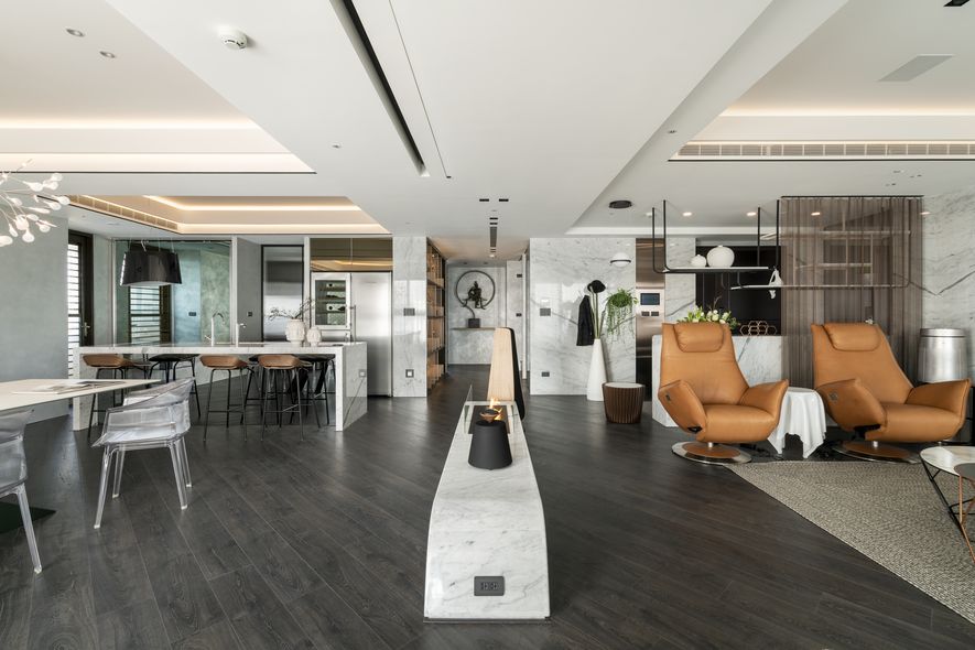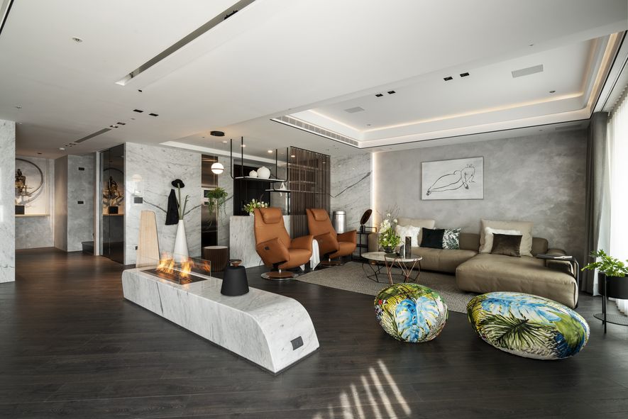 因屋主沒有擺放電視的必要需求,因此在空間規畫上能更加靈活的運用;減去常見的厚重電視牆,改採升降投放設備,讓整體空間感更加寬闊,並在中間擺上壁爐,區隔空間的同時也添加溫暖氛圍。