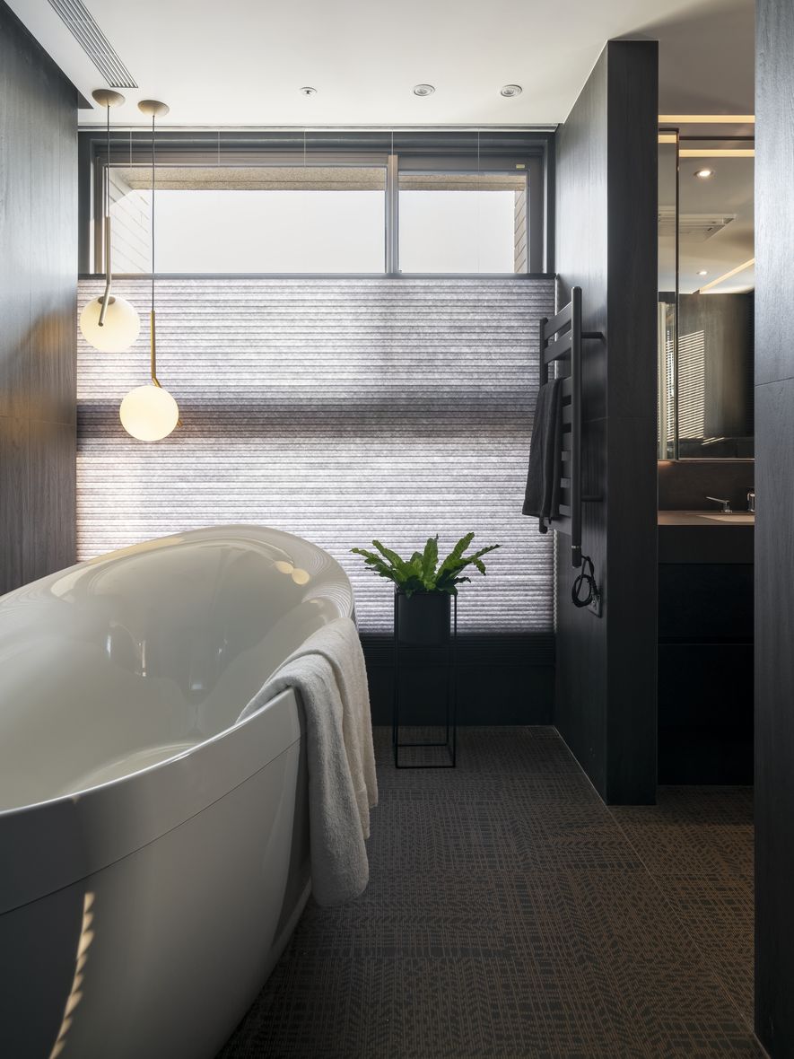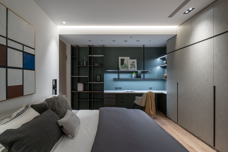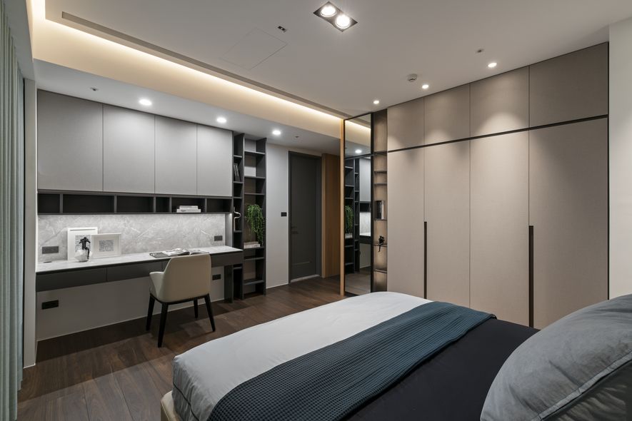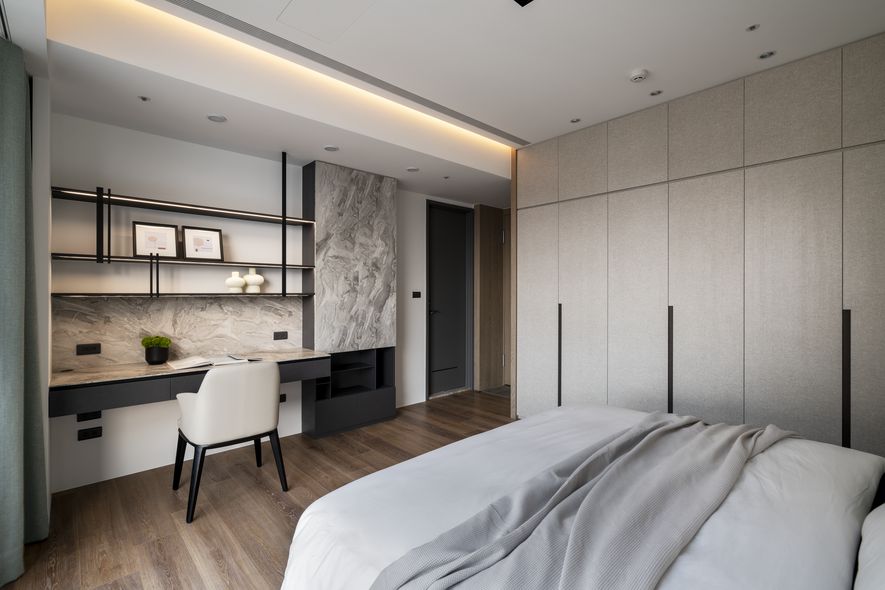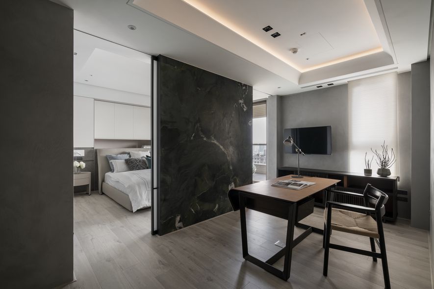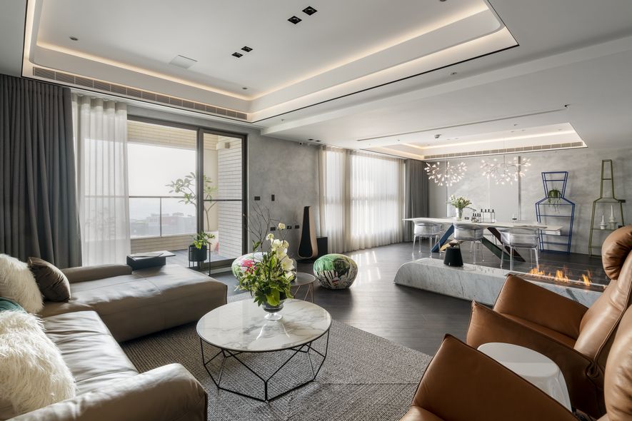 因屋主沒有擺放電視的必要需求,因此在空間規畫上能更加靈活的運用;減去常見的厚重電視牆,改採升降投放設備,讓整體空間感更加寬闊,並在中間擺上壁爐,區隔空間的同時也添加溫暖氛圍。
