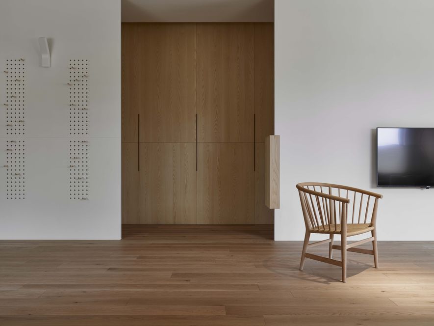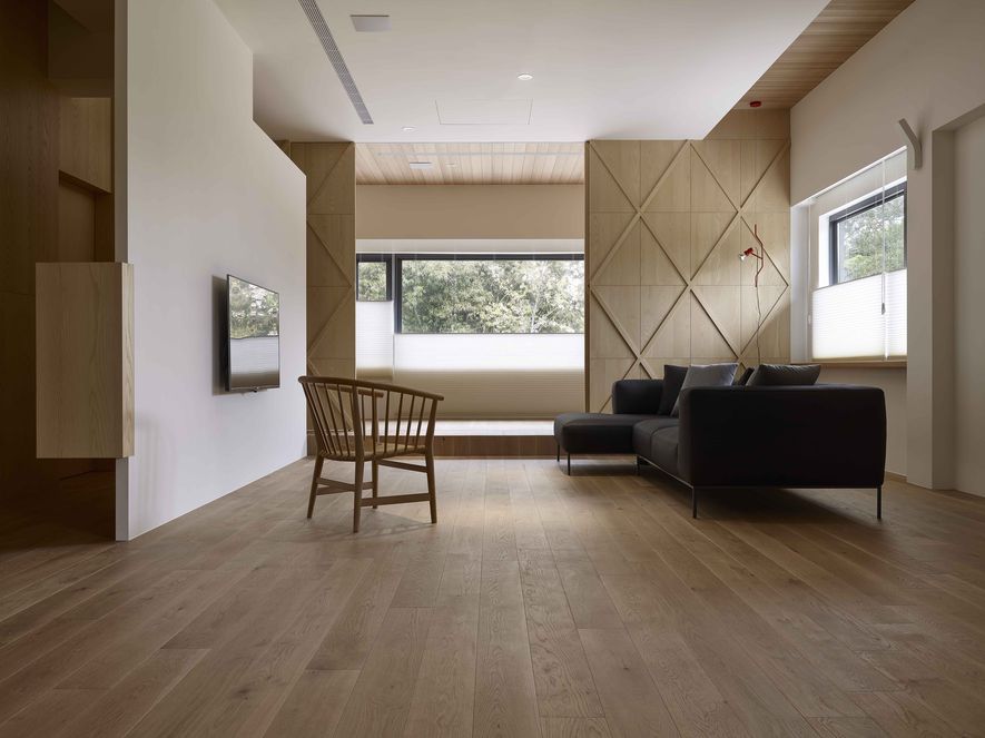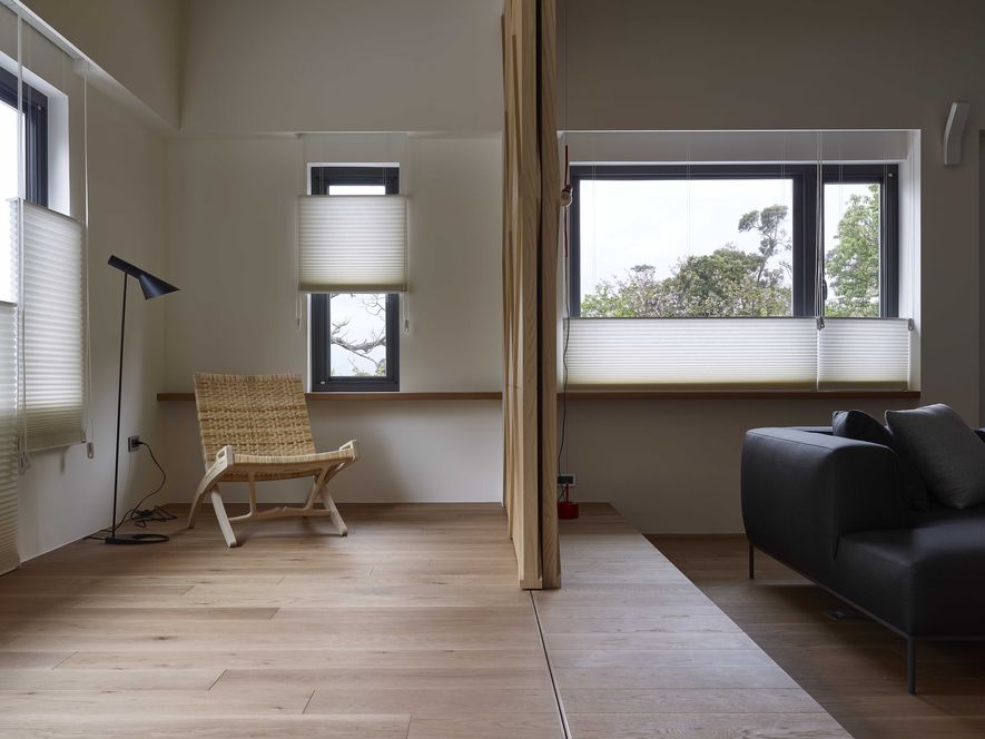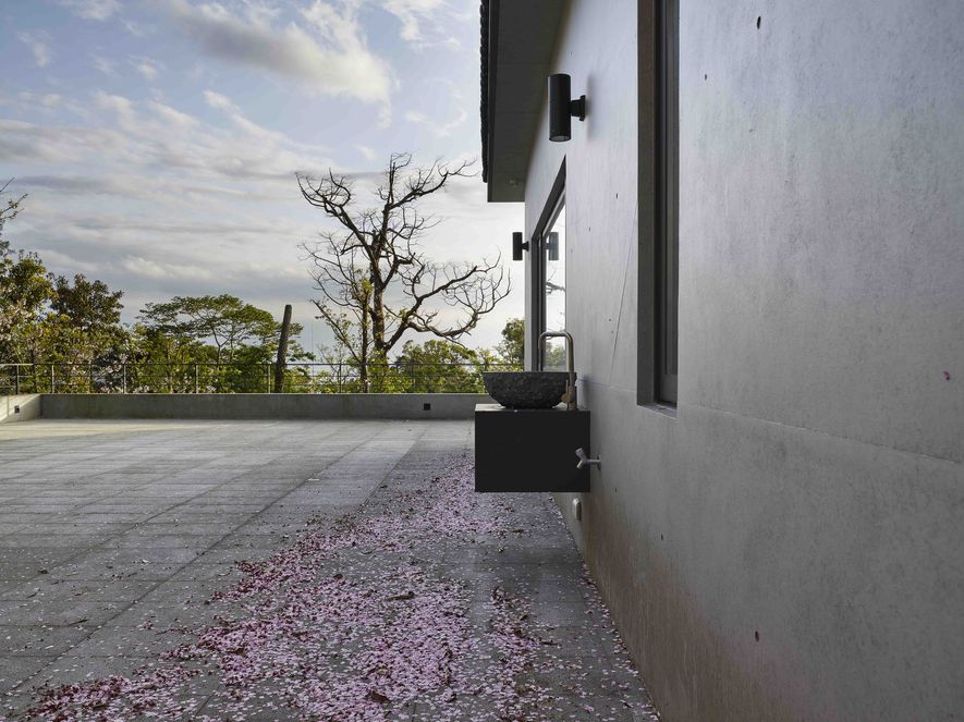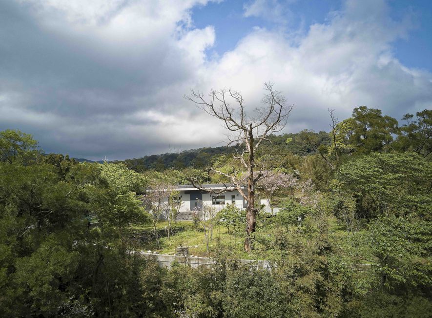 建築座落於綠意環伺的山林間,單層量體與茂密樹木並濟蓊鬱,不刻意攫然獨立,反而隱沒於自然的氣度裡,頗有清代詞癡納蘭容若於《淥水亭》:「野色湖光兩不分,碧雲萬頃變黃雲。分明一幅江村畫,著個閒亭掛夕曛。」把整個淡泊恬靜狀勾勒生動,構成心嚮往之的恬靜理想生活。