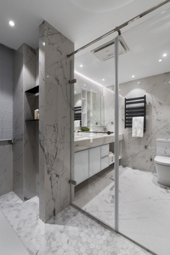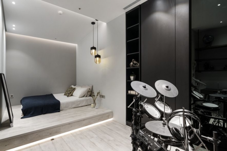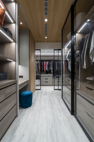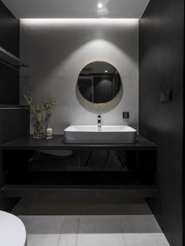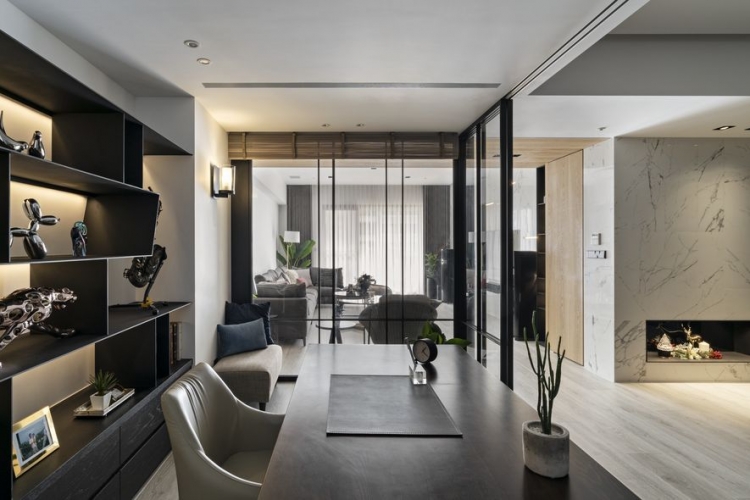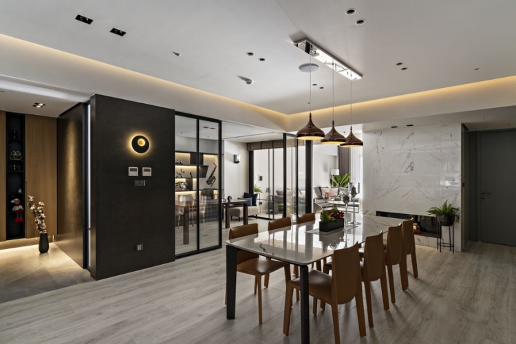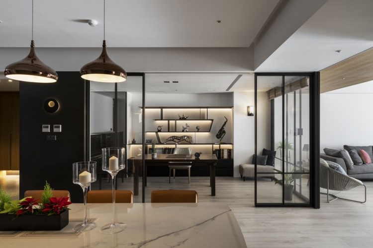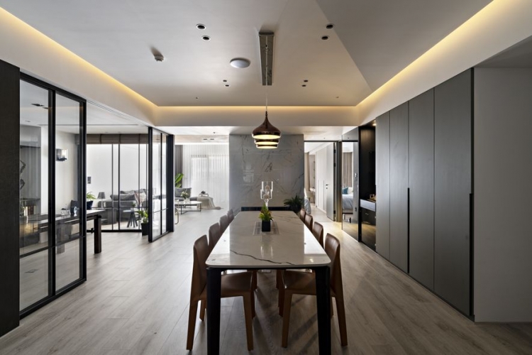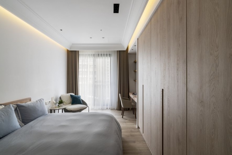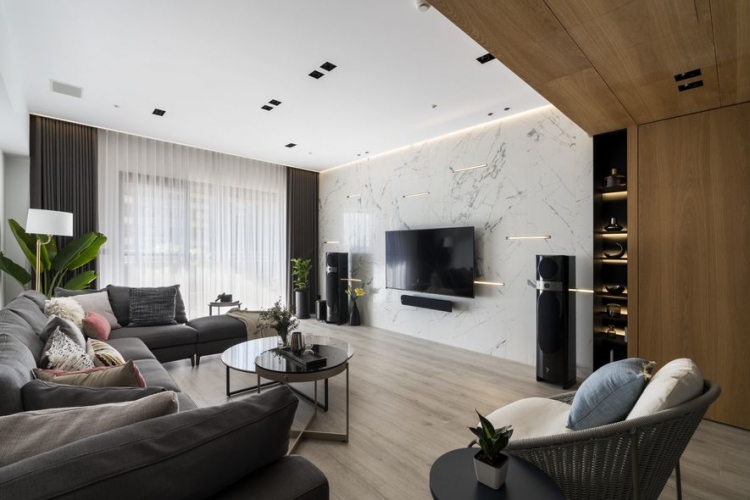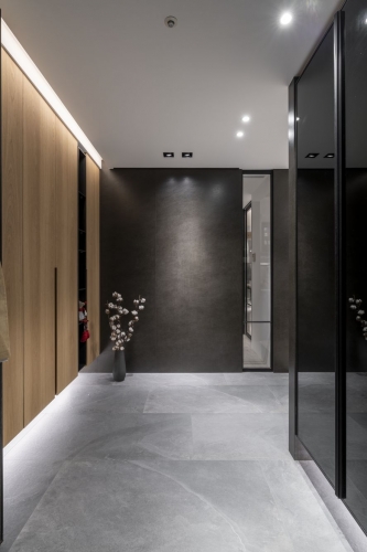空間與動線的配置更是一次就獲得屋主的喜愛與肯定。在忙碌的工作結束之後,回到家中需要完全的放鬆空間,因此有好的音響設備與氣氛調光非常重要,並在全室污水管加以隔音棉包覆,減少水流的噪音;門片內部加裝隔音材,門片下加隔音壓條雙重隔音處理,做足隔音、靜音方面的準備。