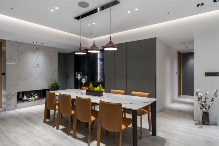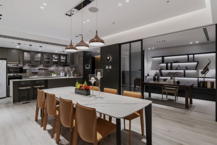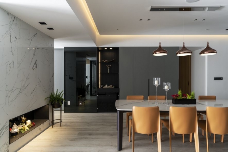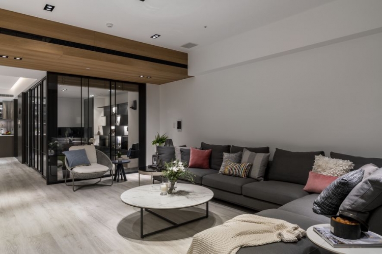 對美感、建材都有相當要求的屋主,一開始就選定了一套灰色系廚具,並希望屋內以黑白灰為主調。於是設計師在空間的材質和色調上,選搭出最和諧的黑白灰組合,使整個空間的色調和廚具相呼應,再搭配一些溫暖的木紋質地,加以點綴些許金色色澤,讓空間多一點柔和的溫度。