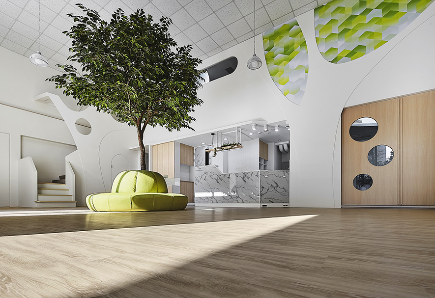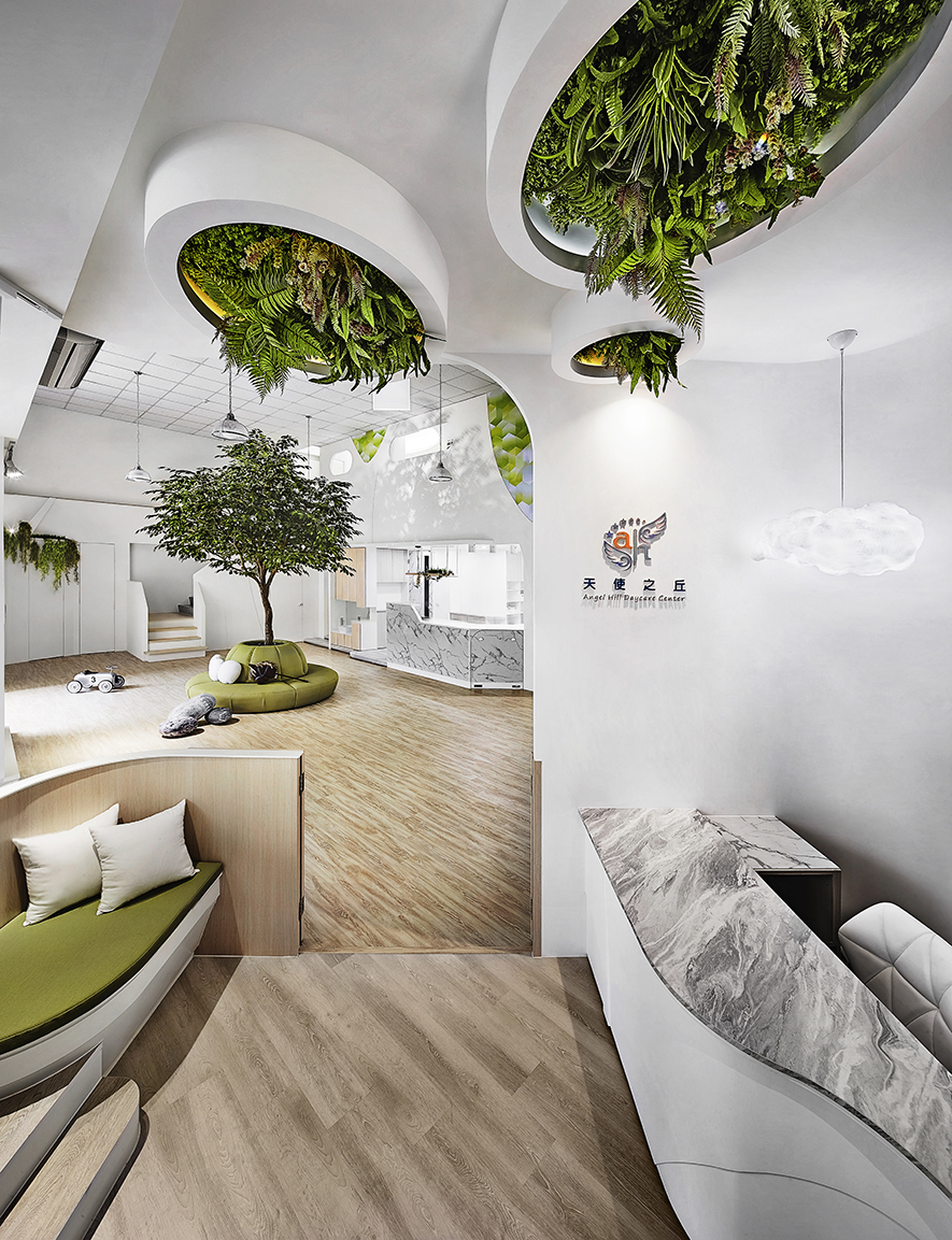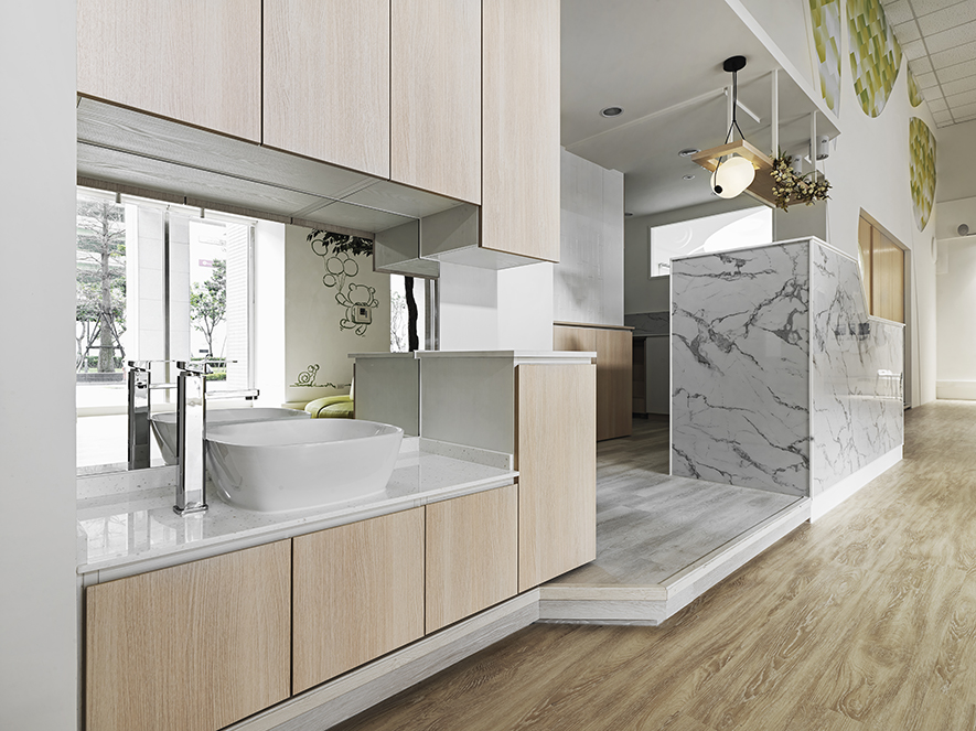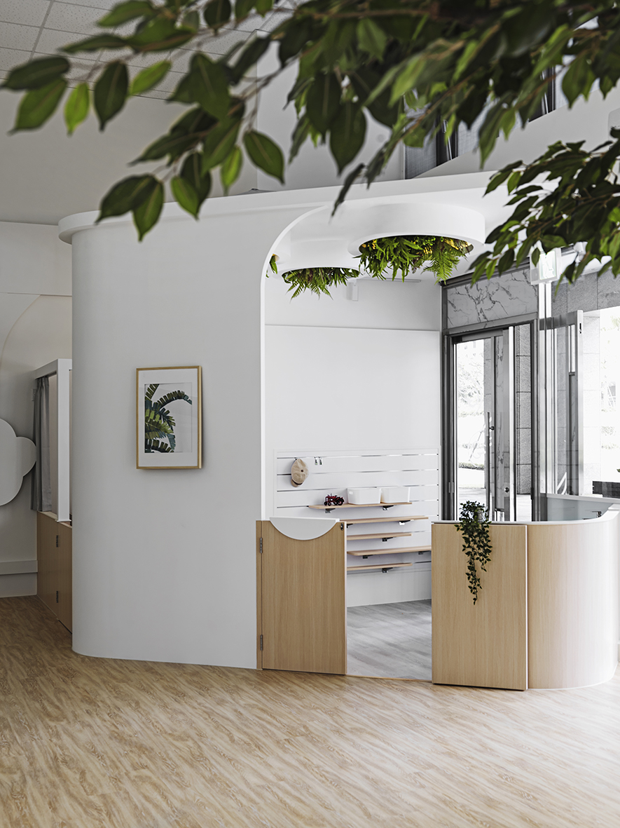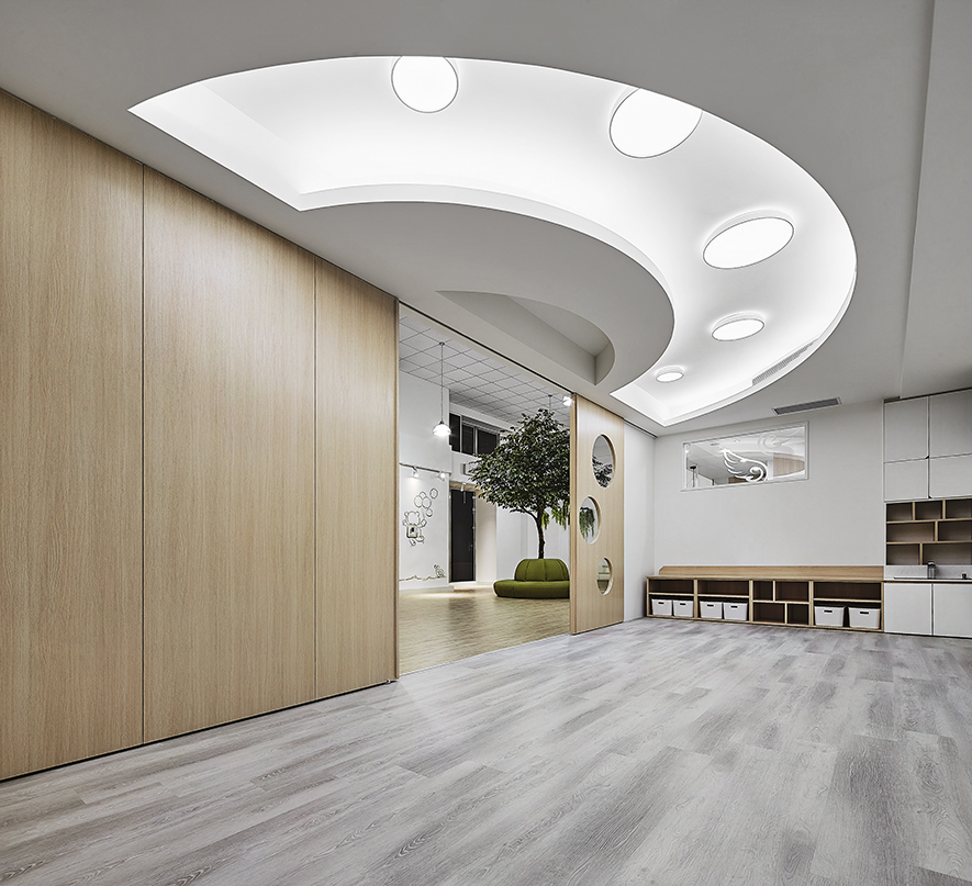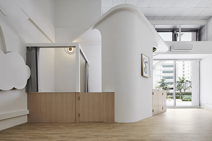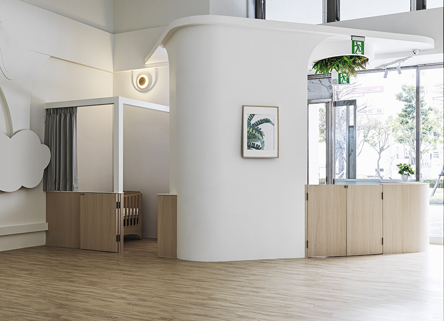 以宛如初生嬰兒的純白作為空間基底,搭配溫暖的木質調,柔化天地壁的固態感,並悄悄植入綠意元素,圍塑一處恬靜淡雅的溫柔境地,張開輕柔臂膀迎接每一位幼兒。