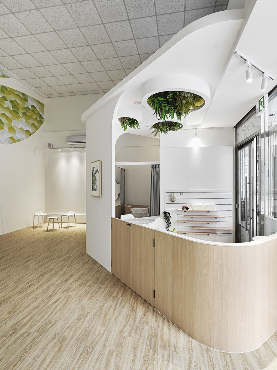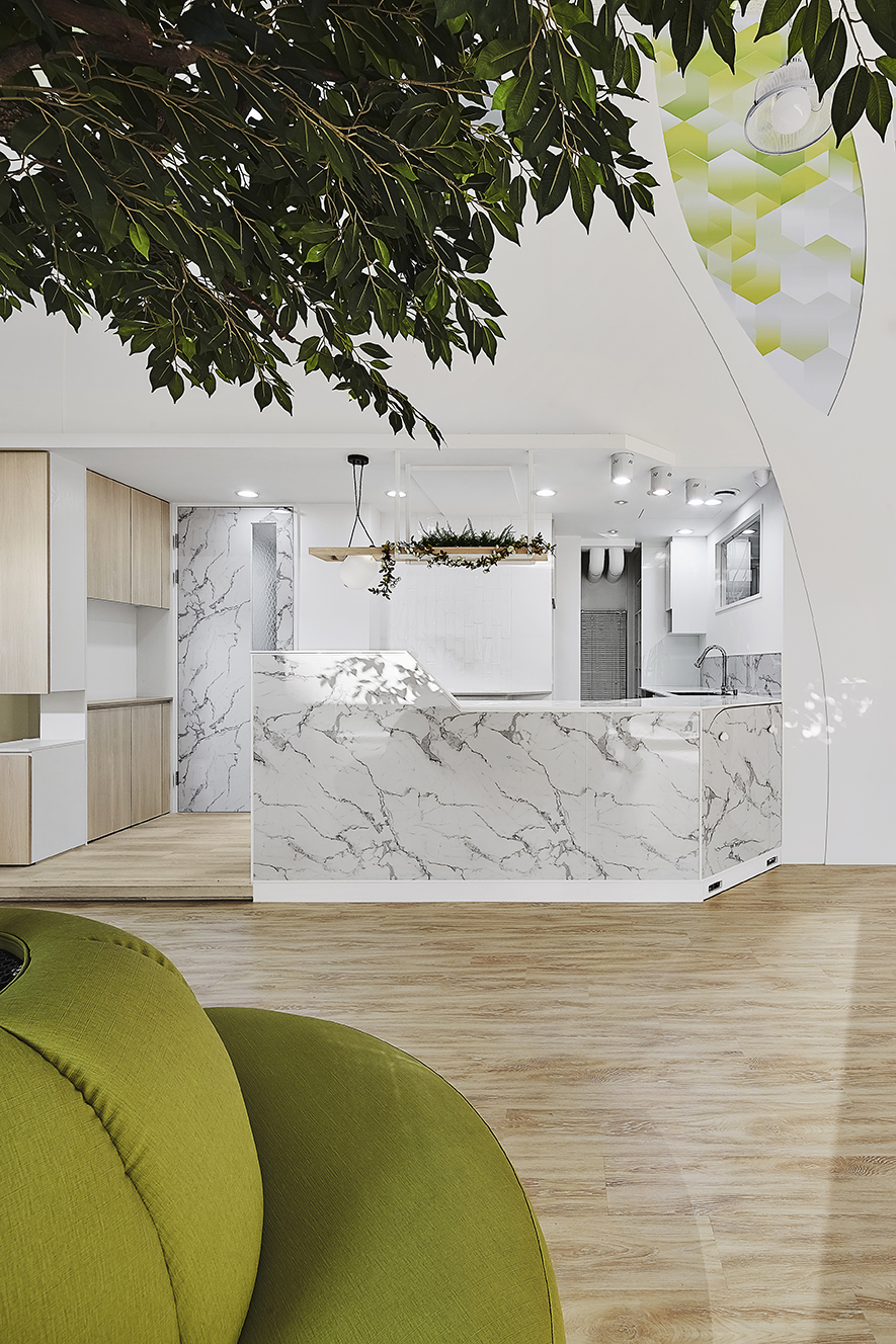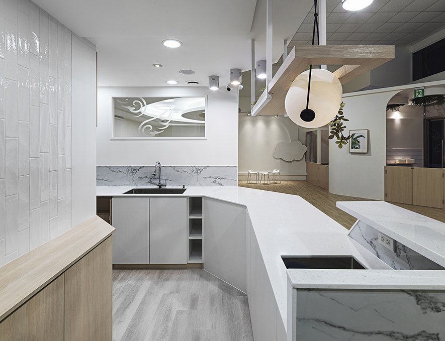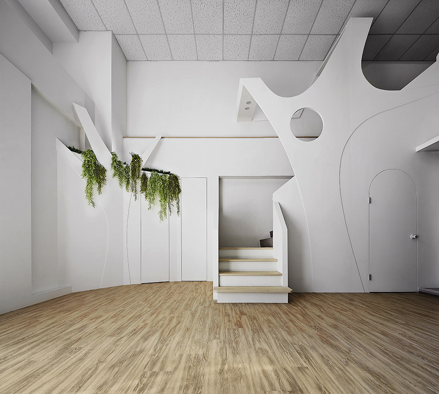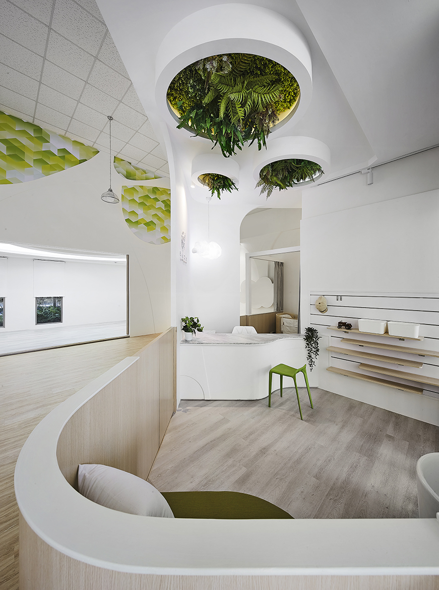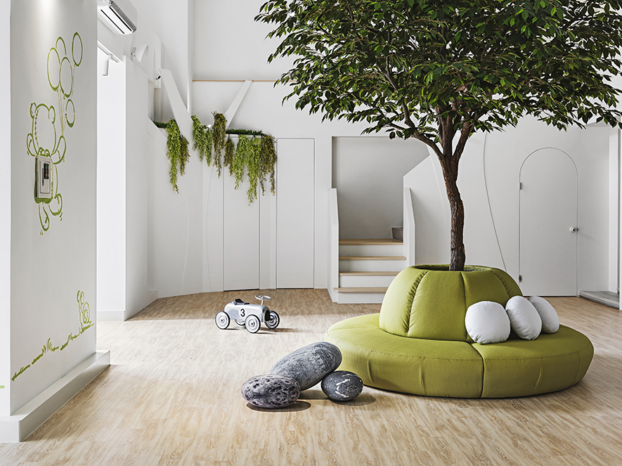 以宛如初生嬰兒的純白作為空間基底,搭配溫暖的木質調,柔化天地壁的固態感,並悄悄植入綠意元素,圍塑一處恬靜淡雅的溫柔境地,張開輕柔臂膀迎接每一位幼兒。