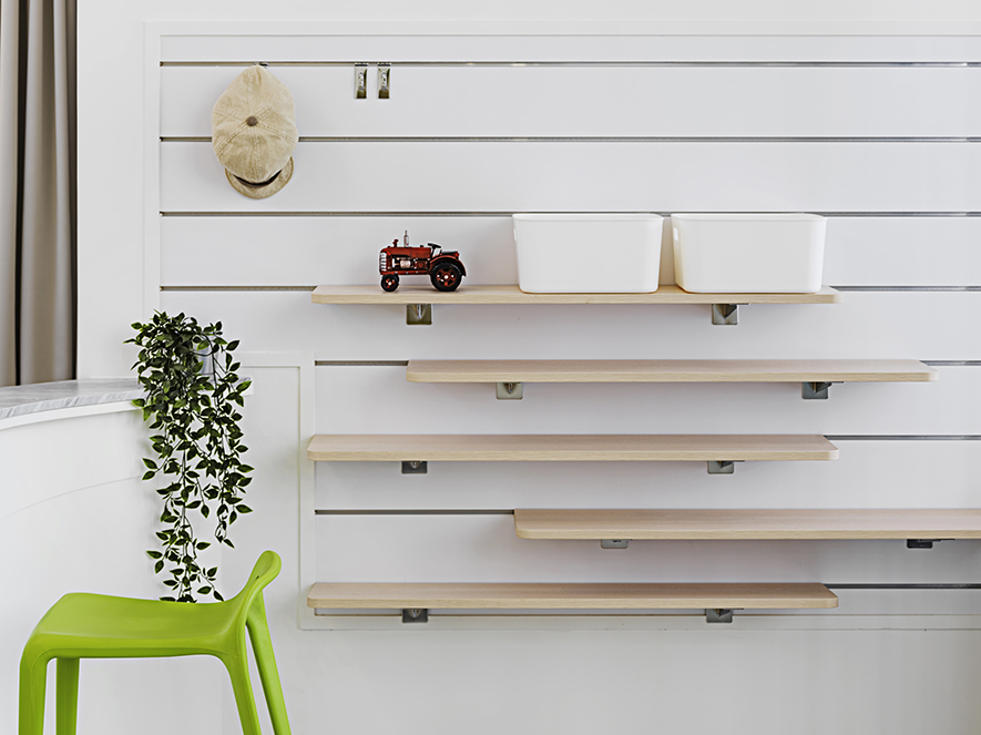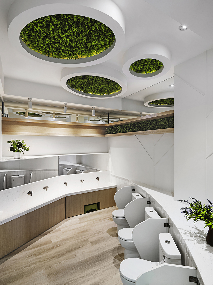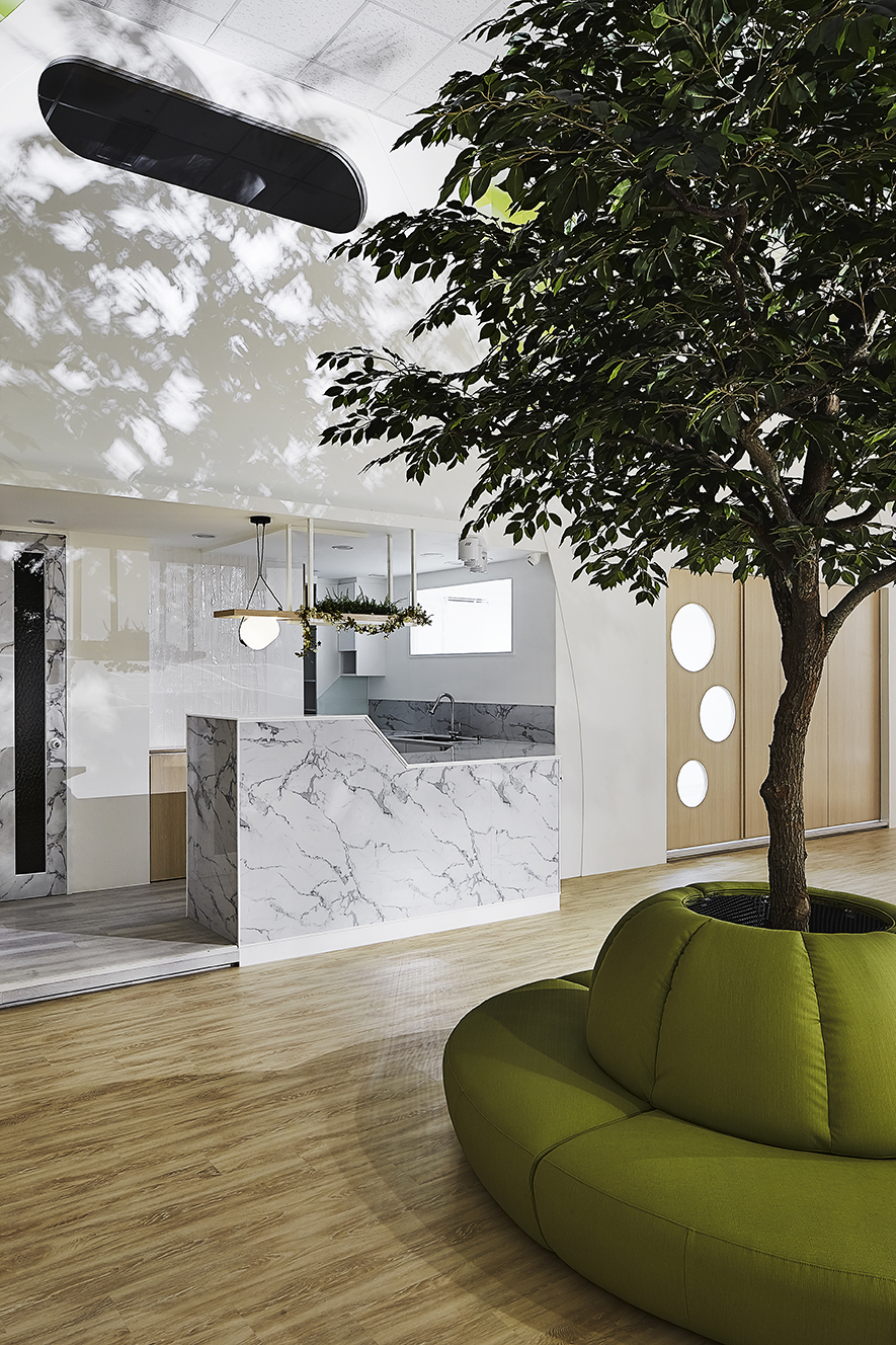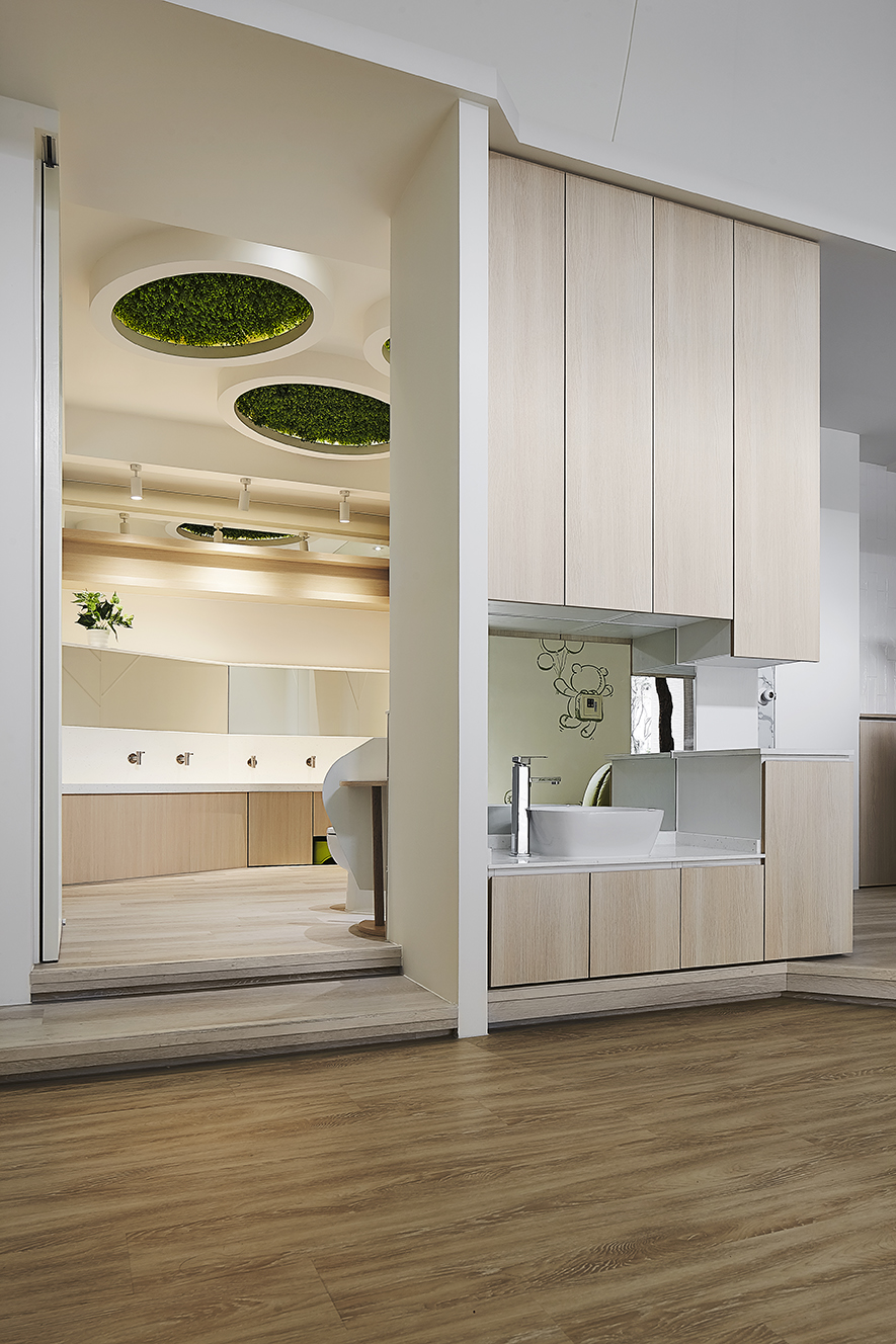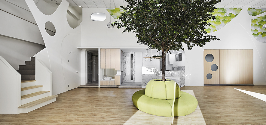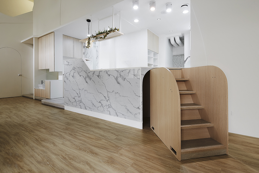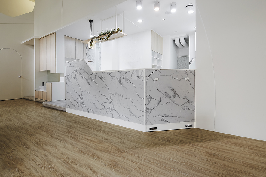 以宛如初生嬰兒的純白作為空間基底,搭配溫暖的木質調,柔化天地壁的固態感,並悄悄植入綠意元素,圍塑一處恬靜淡雅的溫柔境地,張開輕柔臂膀迎接每一位幼兒。