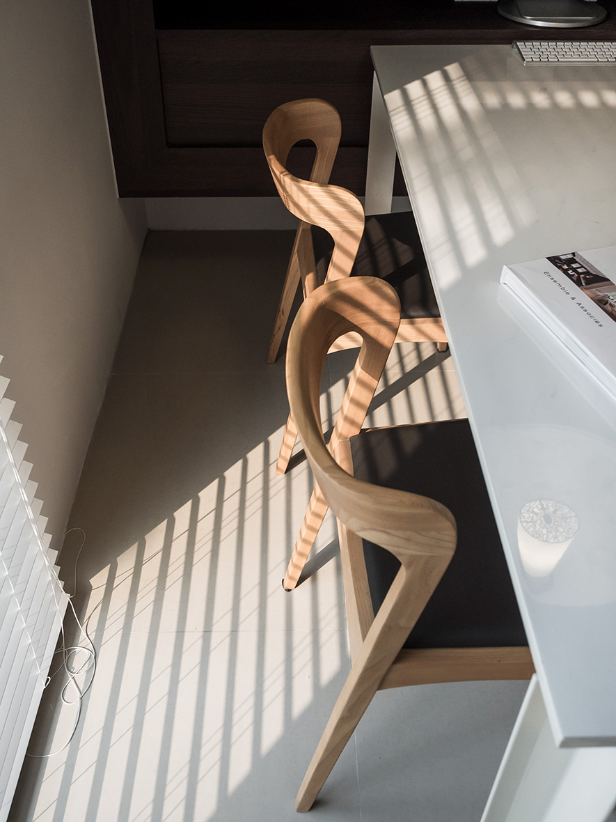 暖色的木質家具,搭配白色系的地磚,溫和明亮的色彩,也讓空間感延伸放大,自然顯現溫暖寧靜的氛圍。從現代簡約、人文優雅的細膩風格作出發,以木勾勒出幾何線條,留白許多空間,讓光線更明亮,溫煦地投影出設計者的用心與巧思。