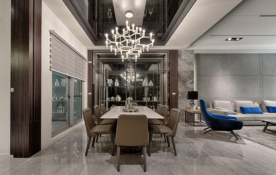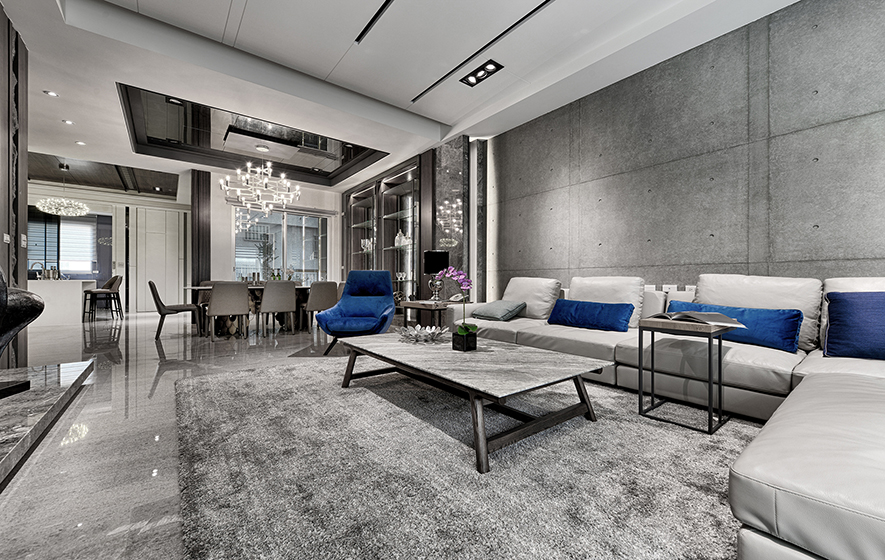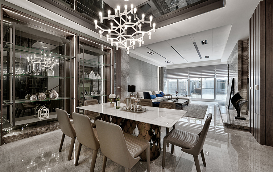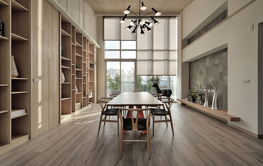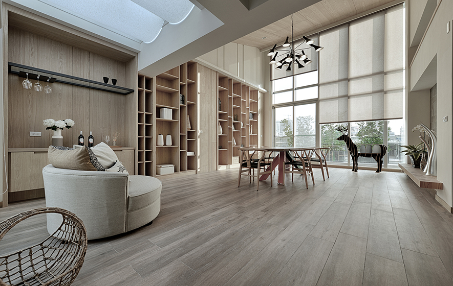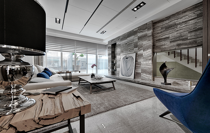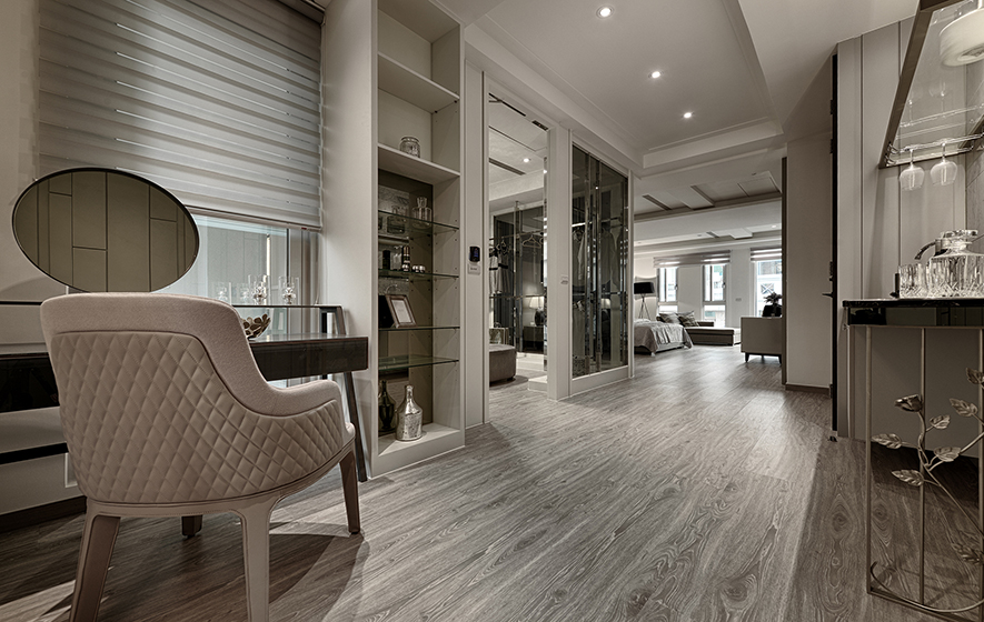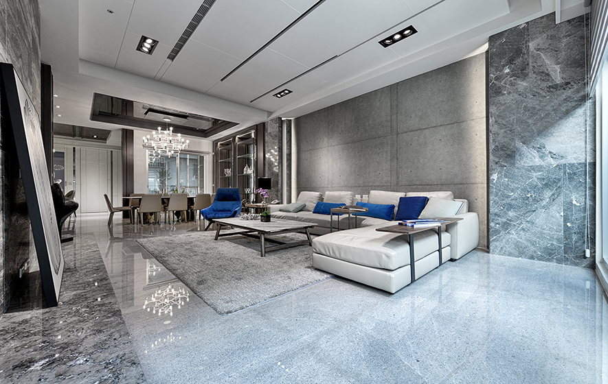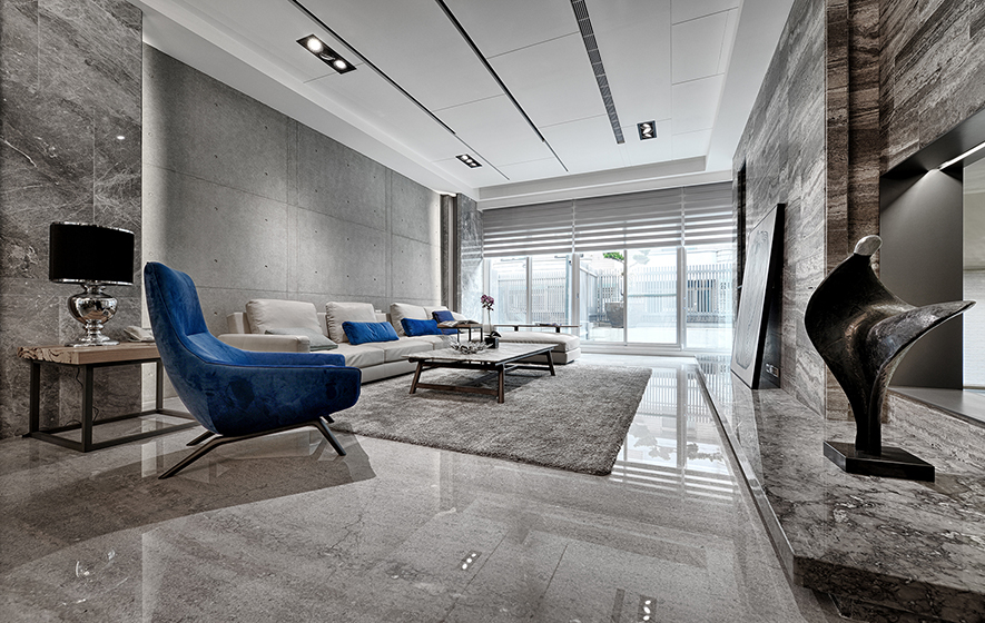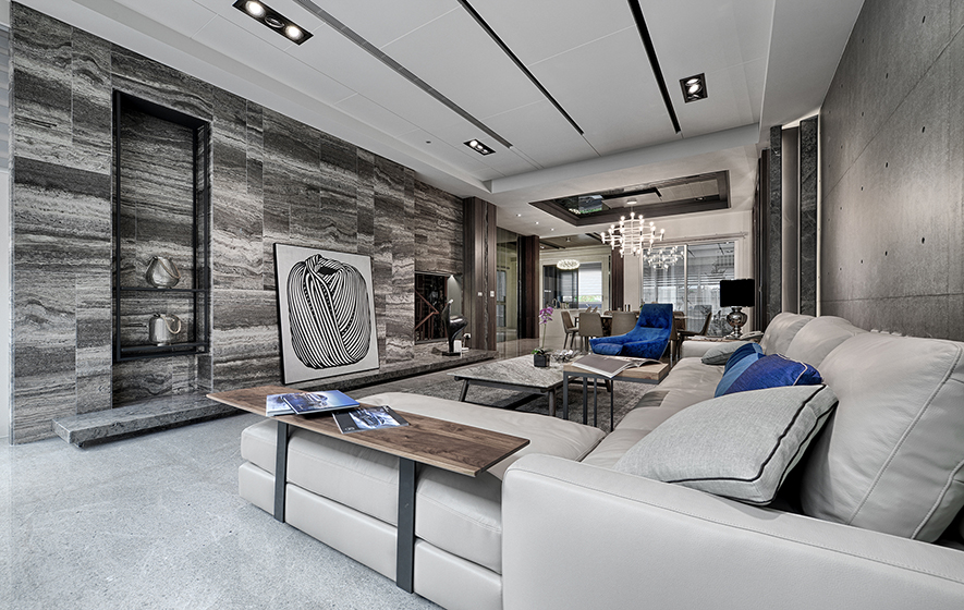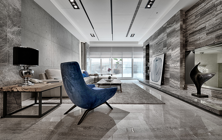 大理石材、實木皮、鐵件、灰玻璃、超耐磨地板