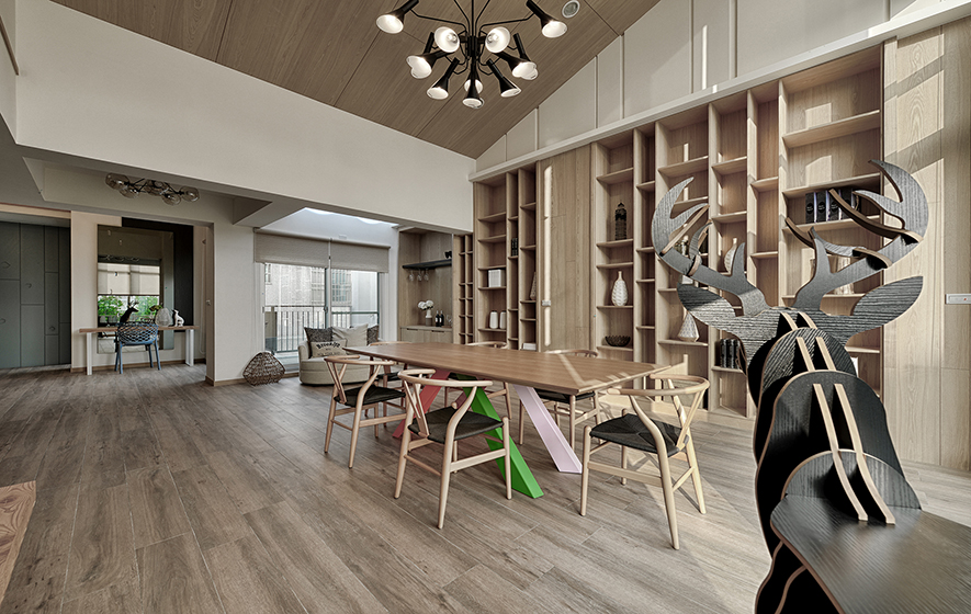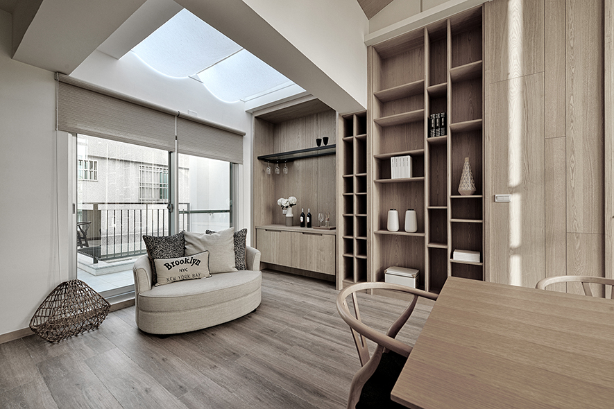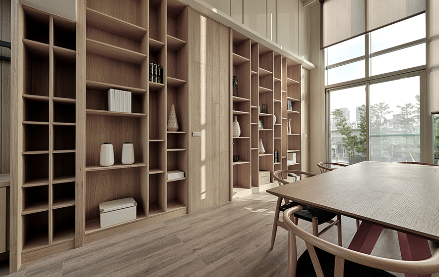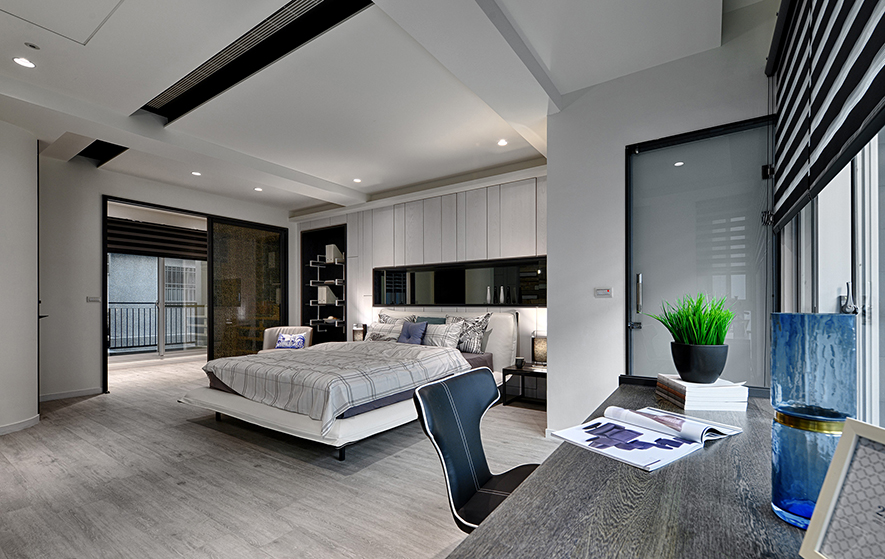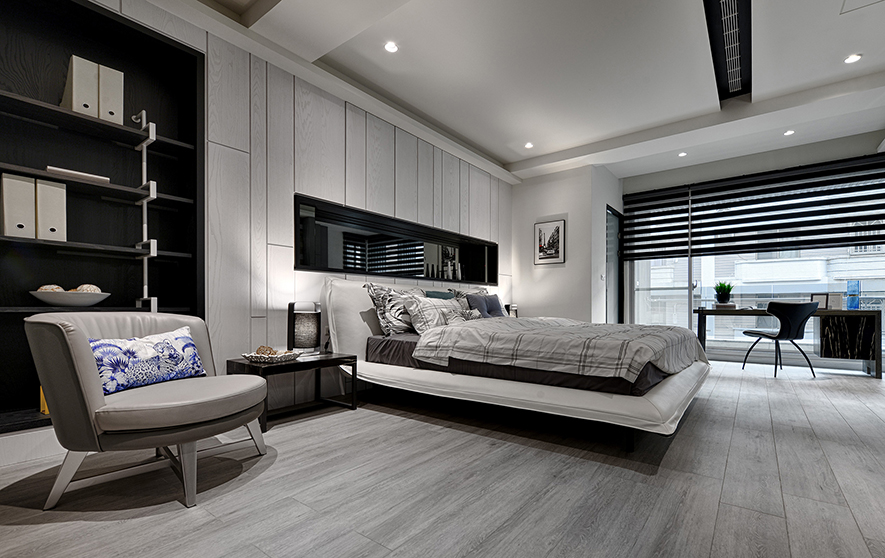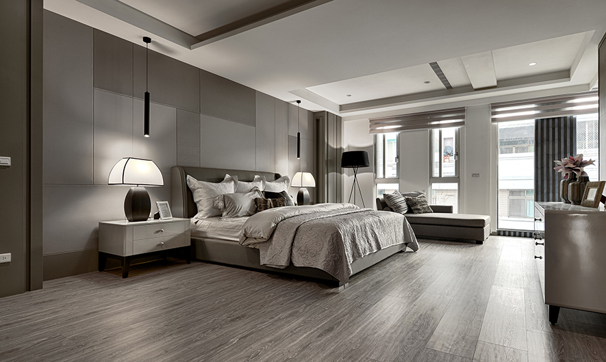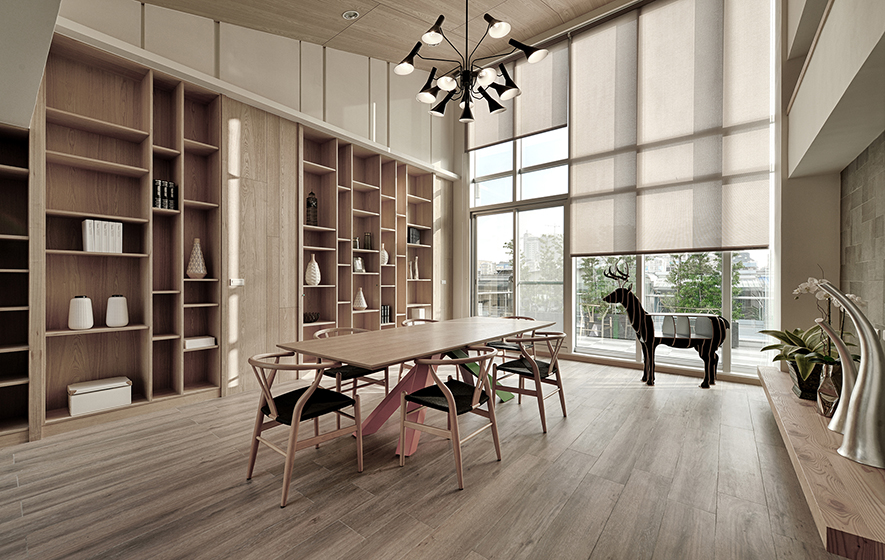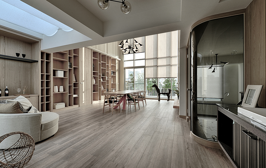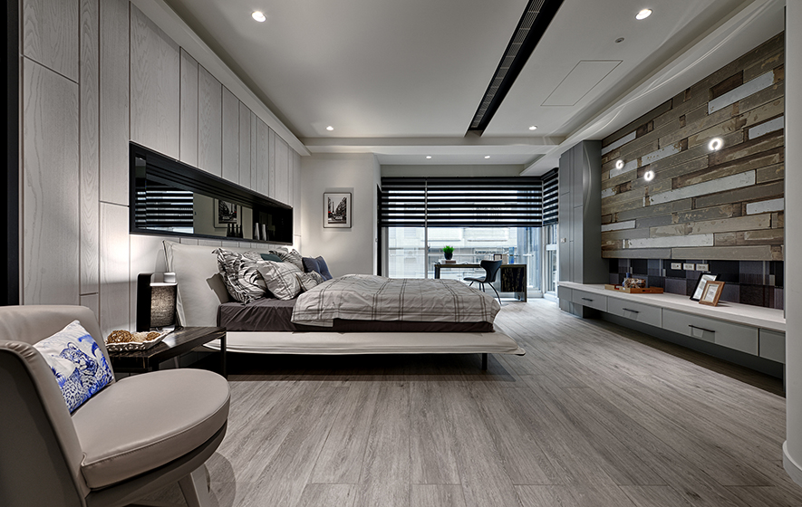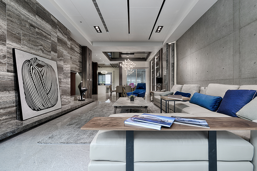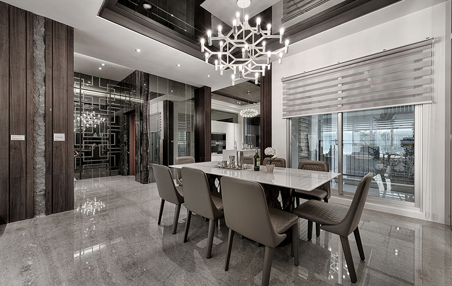 大理石材、實木皮、鐵件、灰玻璃、超耐磨地板