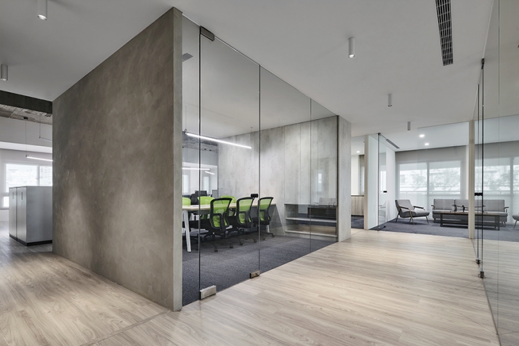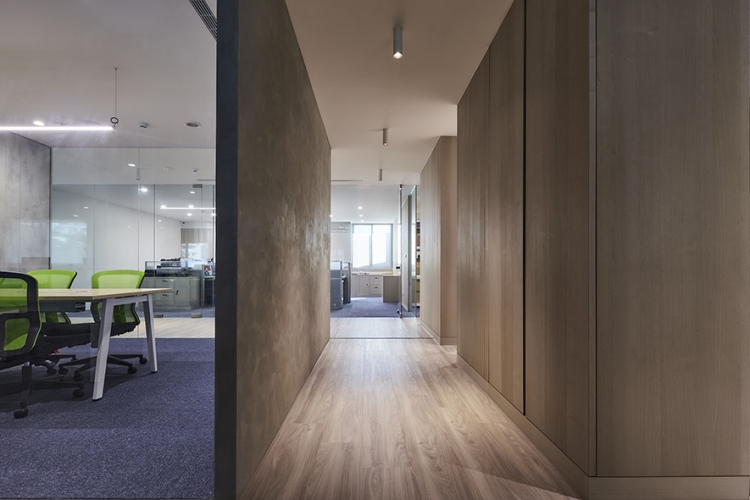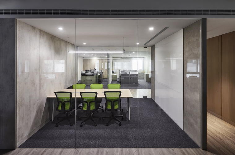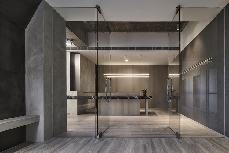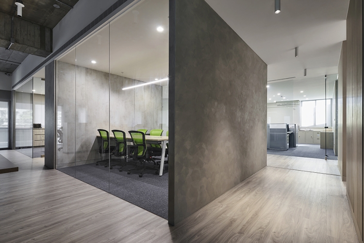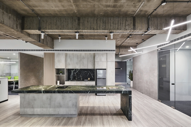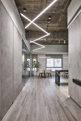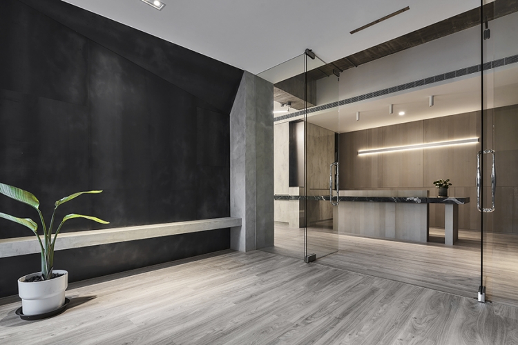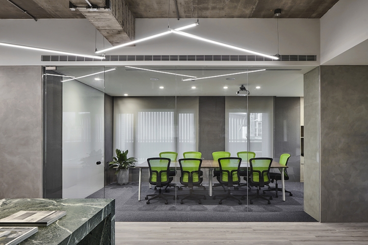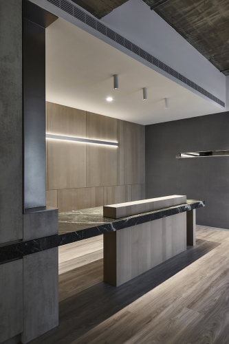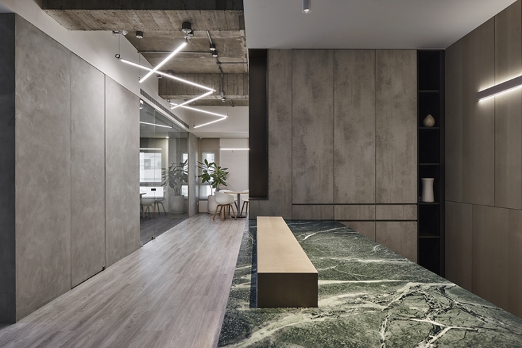 本案為辦公空間,有寬敞的空間優勢,加上天然混凝土的粗曠樓板,入口端景牆搭配造型鐵板,望眼近去則是沉靜的接待櫃台,碧綠石材從水平線上延伸至主空間,休閒空間成了櫃台與私空間的過渡區域,一旁有較放鬆的洽談區,另一側為吧檯區,我們創造了一個開放式中島,讓人在此休憩,也是能討論事宜的地方,成為空間主軸。不同類型的辦公空間,我們運用地坪的轉換,不僅柔化空間也提昇氛圍的溫潤感,廊道中水泥與木紋牆面的量體關係,使空間更俐落,線型燈具與金屬管線也點綴出空間張力,整體呈現自然大地的沉靜質樸。