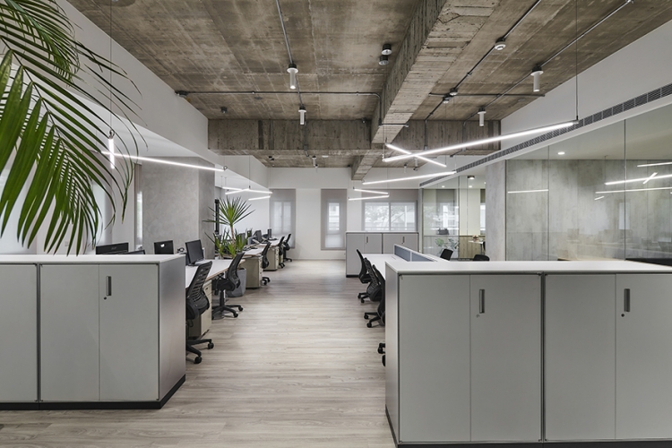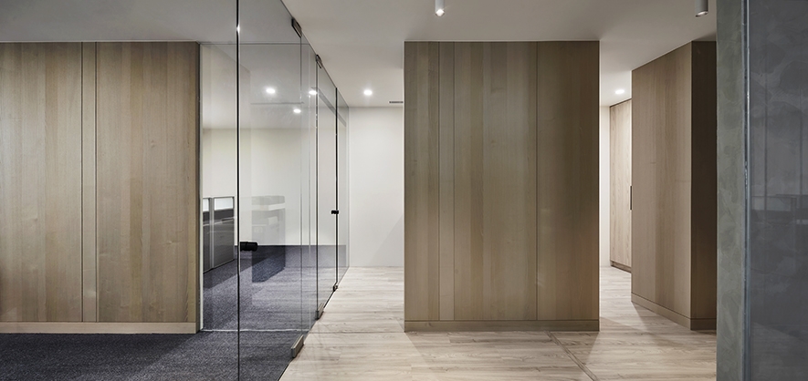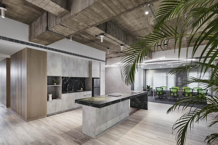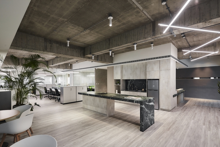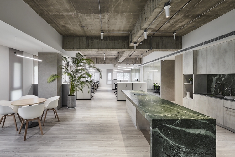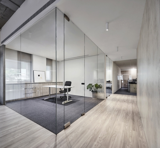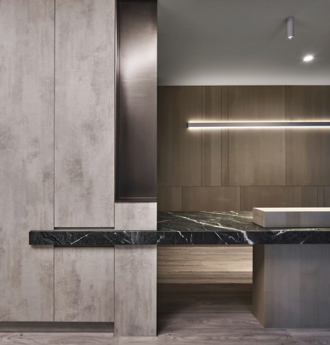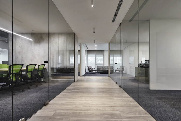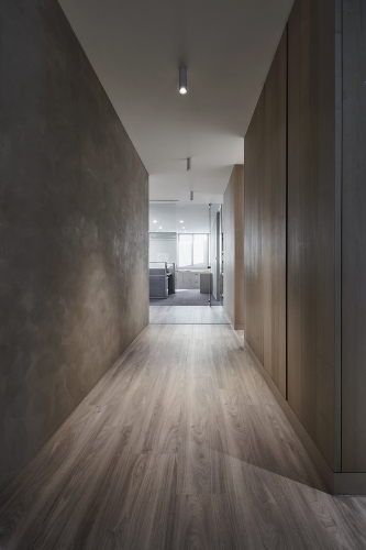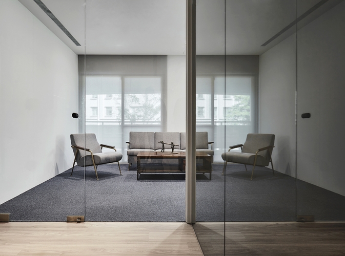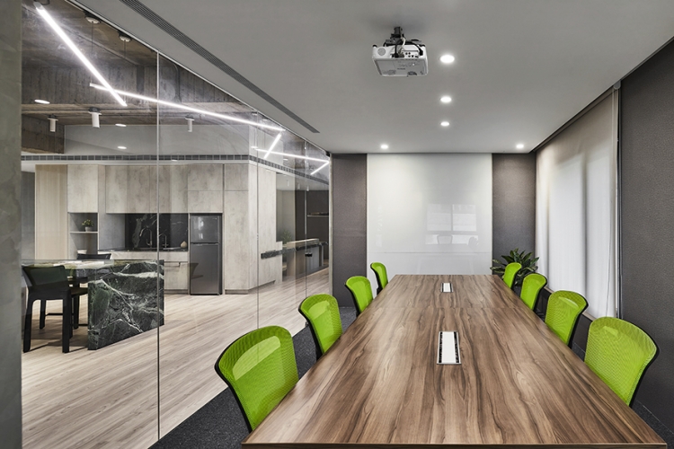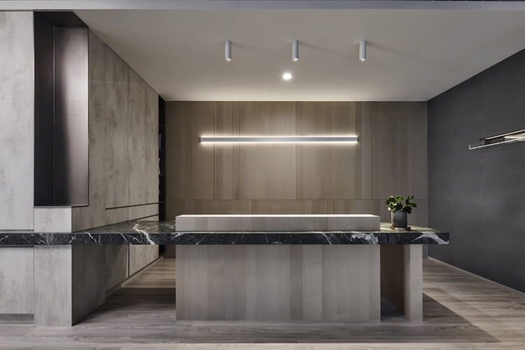 本案為辦公空間,有寬敞的空間優勢,加上天然混凝土的粗曠樓板,入口端景牆搭配造型鐵板,望眼近去則是沉靜的接待櫃台,碧綠石材從水平線上延伸至主空間,休閒空間成了櫃台與私空間的過渡區域,一旁有較放鬆的洽談區,另一側為吧檯區,我們創造了一個開放式中島,讓人在此休憩,也是能討論事宜的地方,成為空間主軸。不同類型的辦公空間,我們運用地坪的轉換,不僅柔化空間也提昇氛圍的溫潤感,廊道中水泥與木紋牆面的量體關係,使空間更俐落,線型燈具與金屬管線也點綴出空間張力,整體呈現自然大地的沉靜質樸。