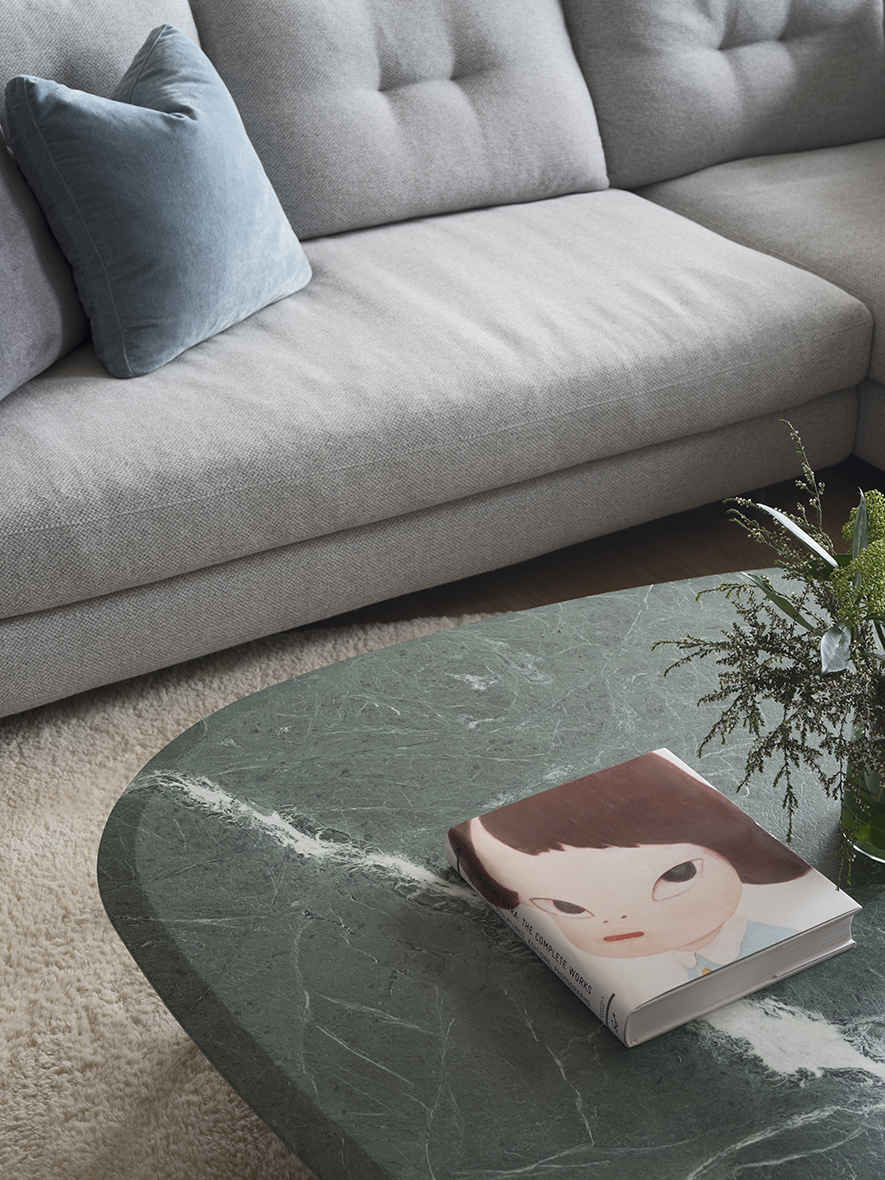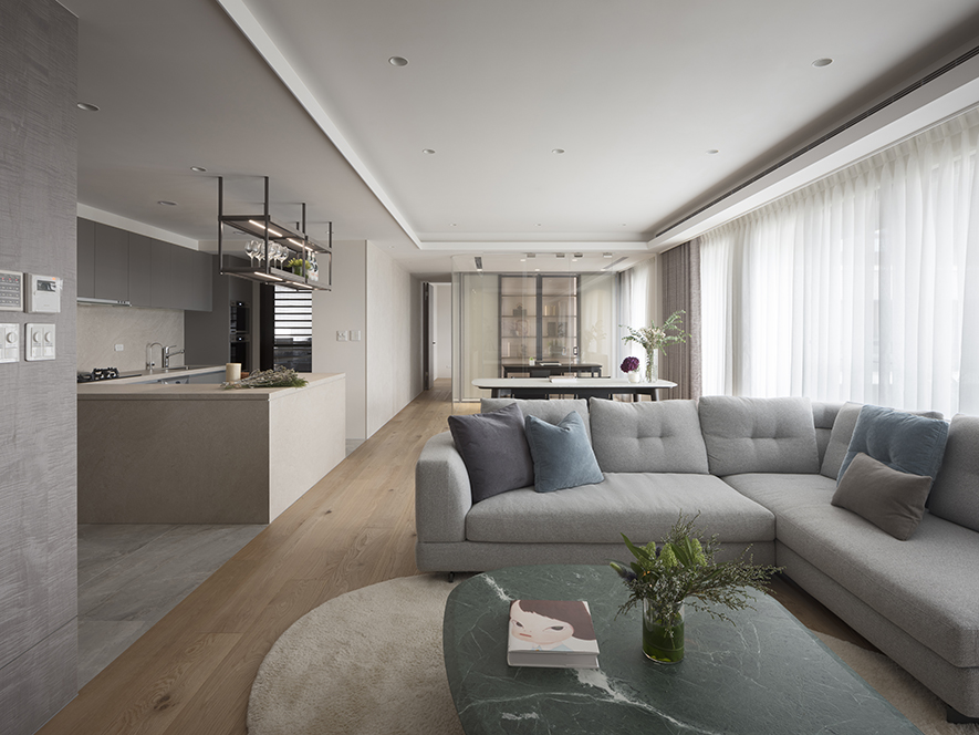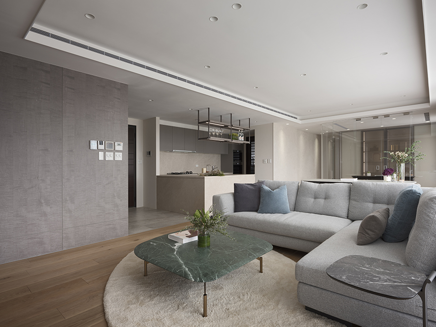 以霜灰色的中性色彩,透過或深或淺的層次,引申靜謐、祥和的生活日常,總和場預表情,流佈空間線條;藉由義大利水波紋木皮回應砂岩、藝術漆底的自然肌理,所勾勒的各類形廓賦象,都不離長年旅居海外的屋主喜好與品味的生活故事…