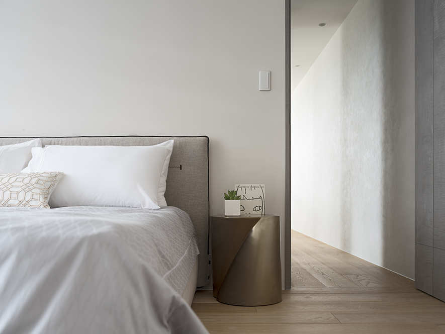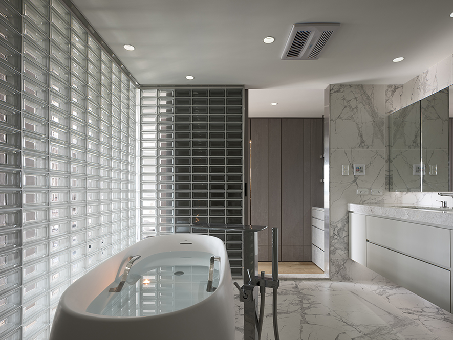 主臥與衛浴以飯店質感的設計概念為主軸,以進口玻璃磚厚實的特質為二者區域的中介,適當的引光入內,依循材質帶來透光不透影的效果,充裕的光線迤灑入室,即使未開窗的衛浴空間,也可以保有水天一色的體現與感受。