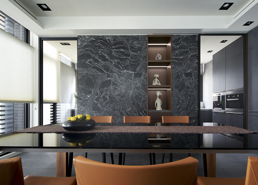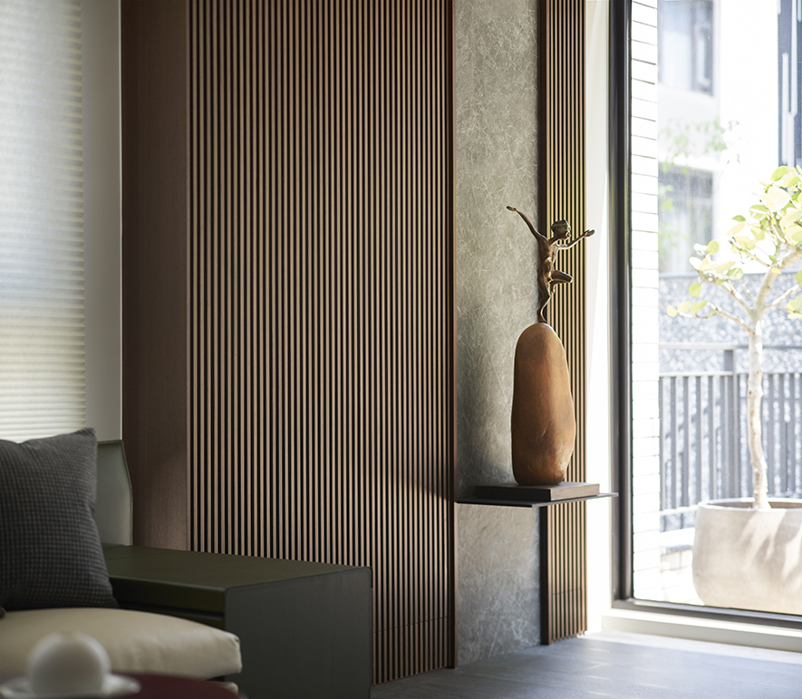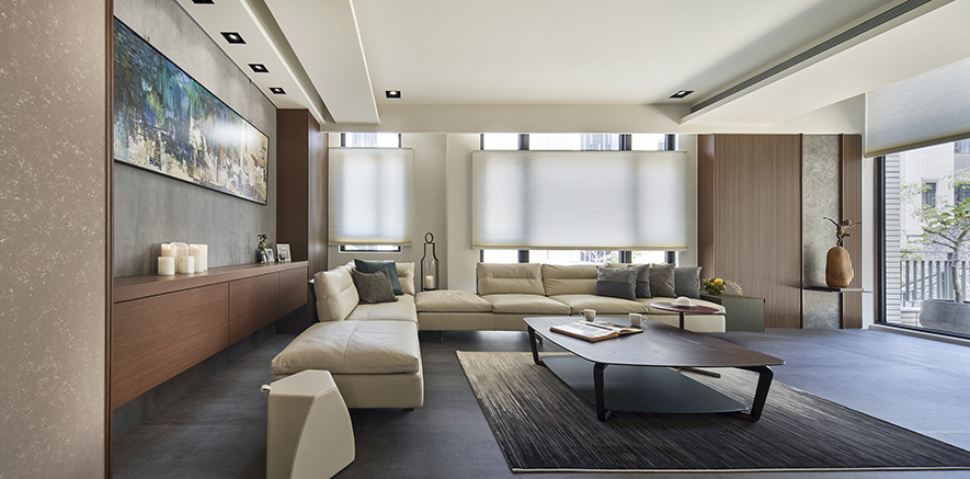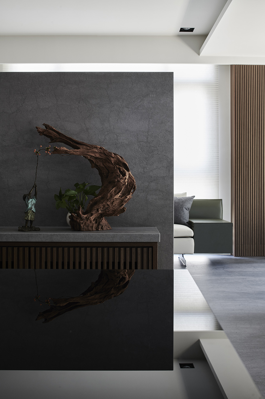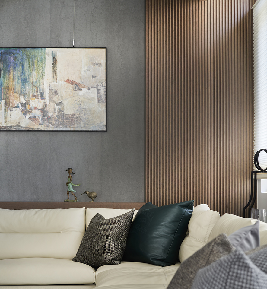 沉穩的深灰地坪,溫潤的木質紋理,在一室和暖天光的映照下,散發舒緩寧靜氛圍,襯托點綴其中畫作、雕塑與花藝,於此注入人文氣息獨有的詩意與溫度,豐富日常風景。