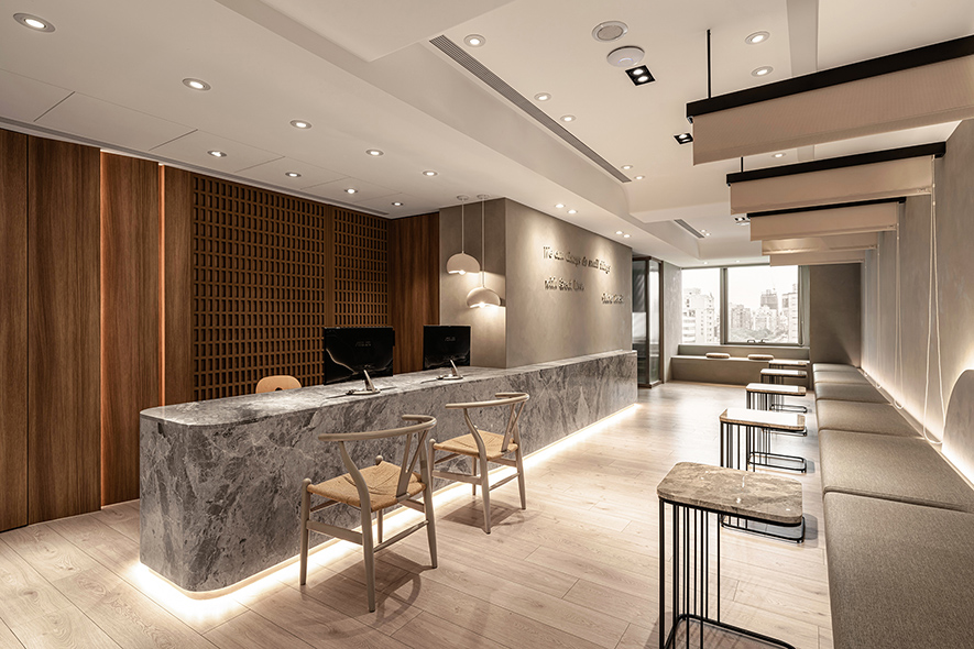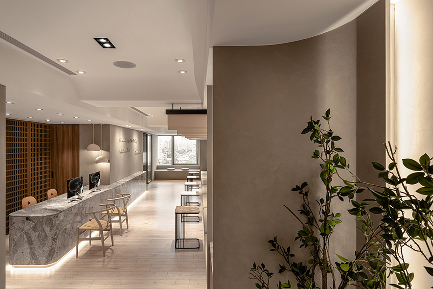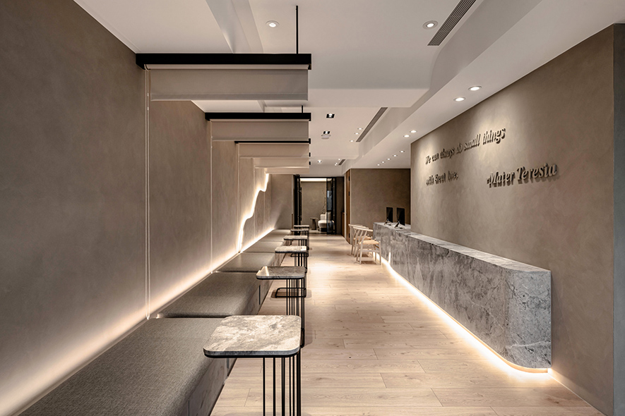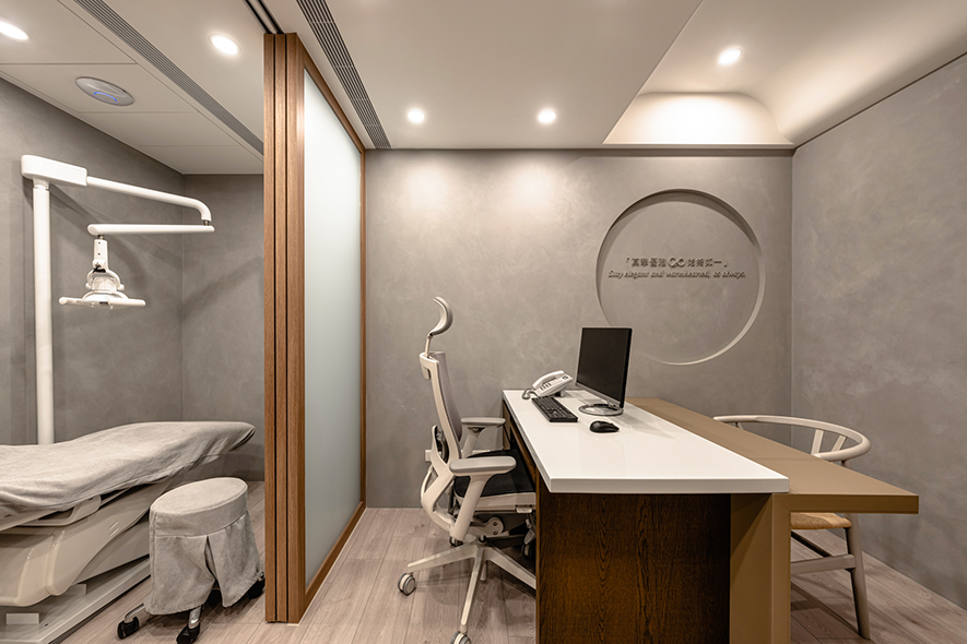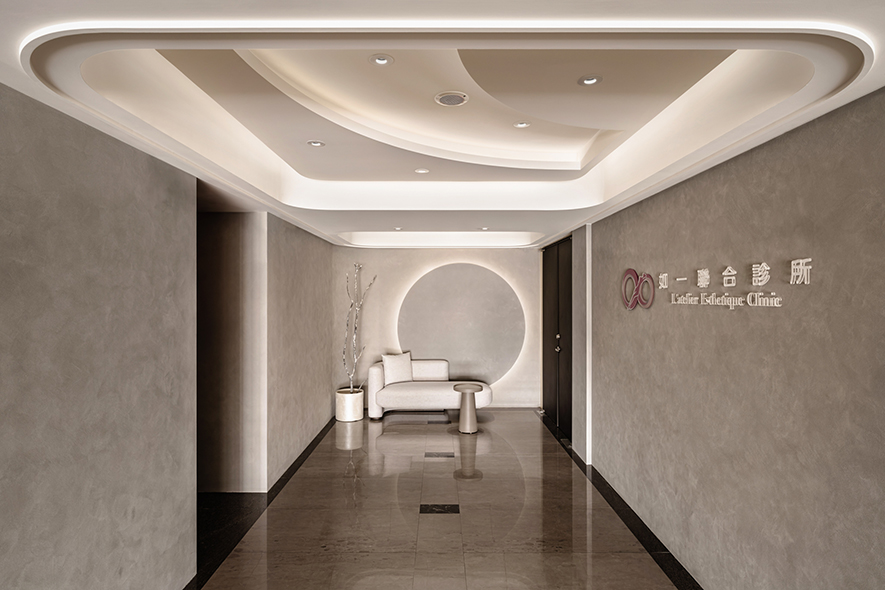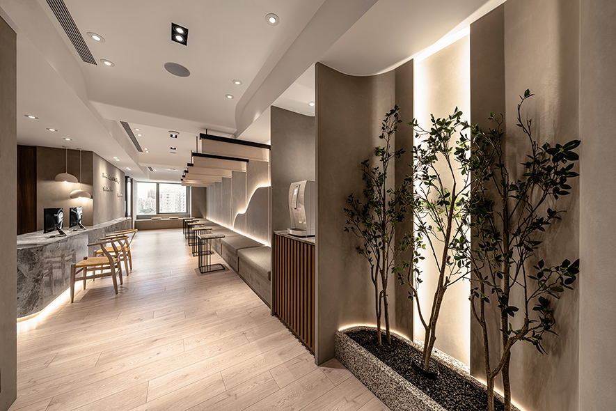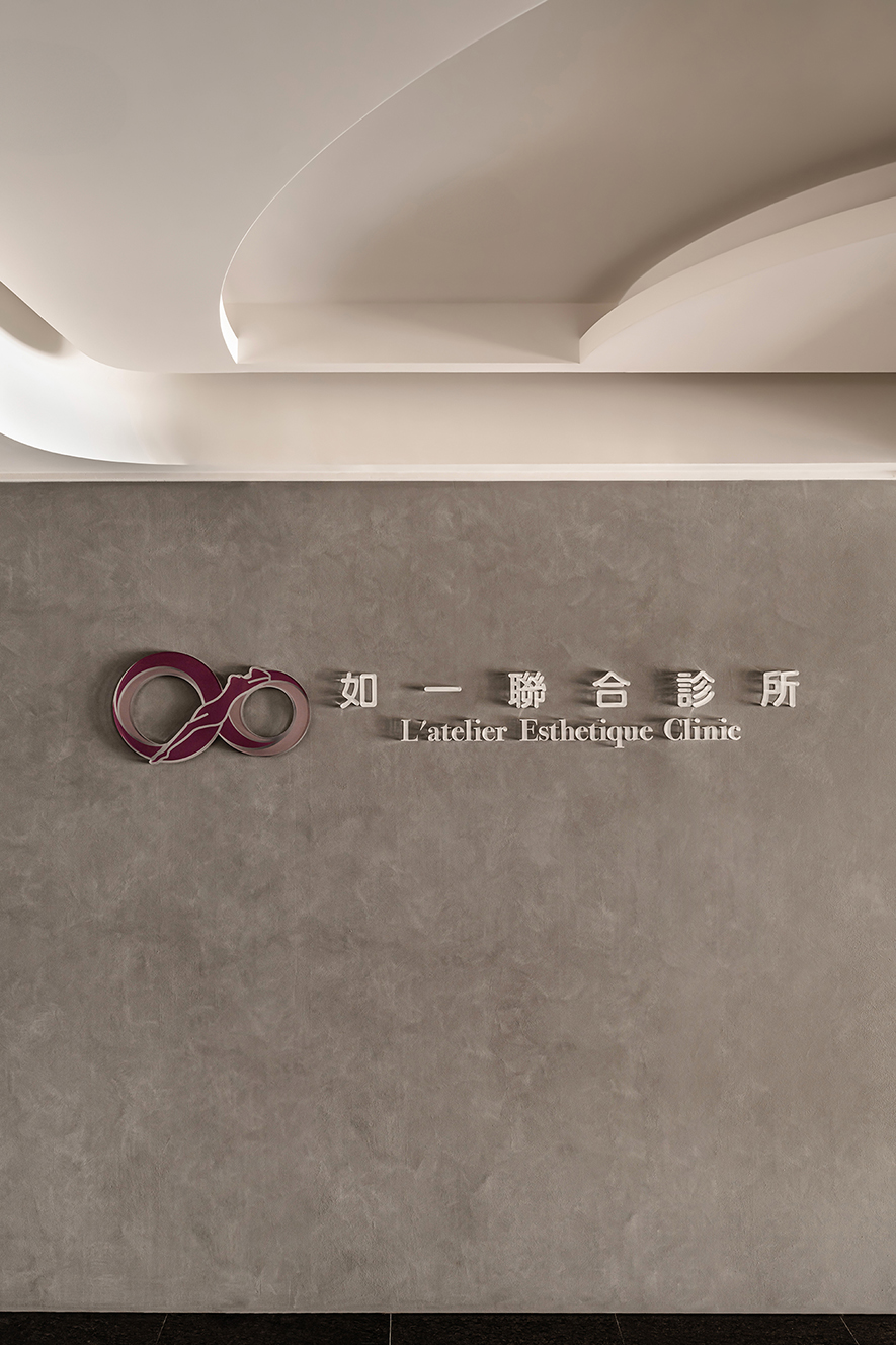 呼應企業商標的圓潤造型、以及提供女性客群為主的醫美服務,設計師於多處立面、天壁匯入流線、圓弧設計,象徵女子優雅的身體曲線,並將業者「以人工美呈現自然美」的理念作為設計核心,藉由同是人為的室內裝修展現天成美感,全案鋪敘木質、大理石與仿混凝土質感的特殊塗料,輔以入口旁植栽區、走廊末端引入的天光,挹來置身戶外般的純淨自然氣息,間或點綴布藝、鍍鈦鐵件等人造材質,堆疊細處層次感同時,完美呈遞融匯品牌概念的醫療場所。