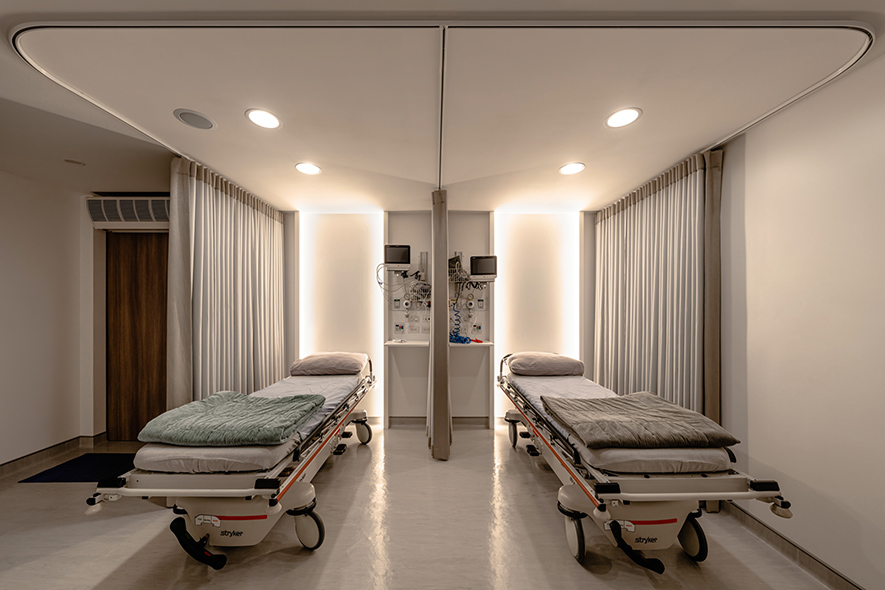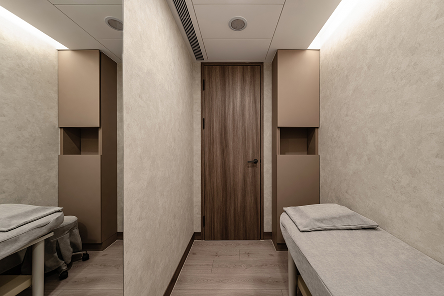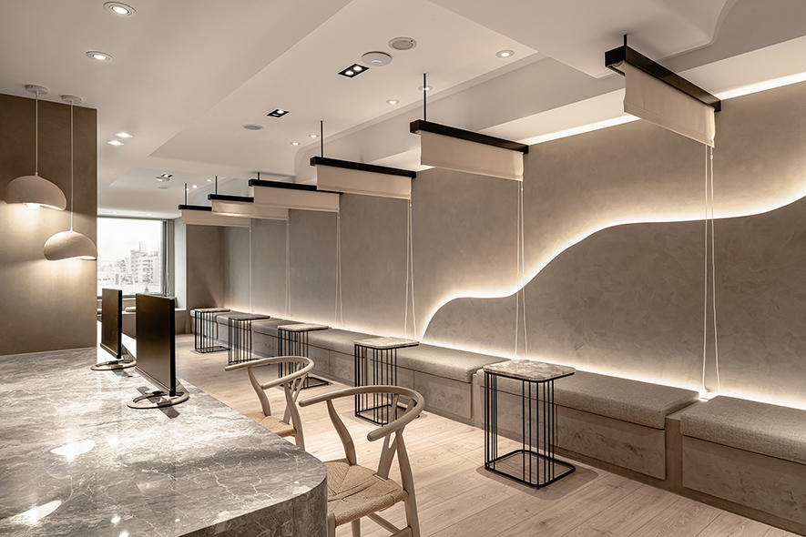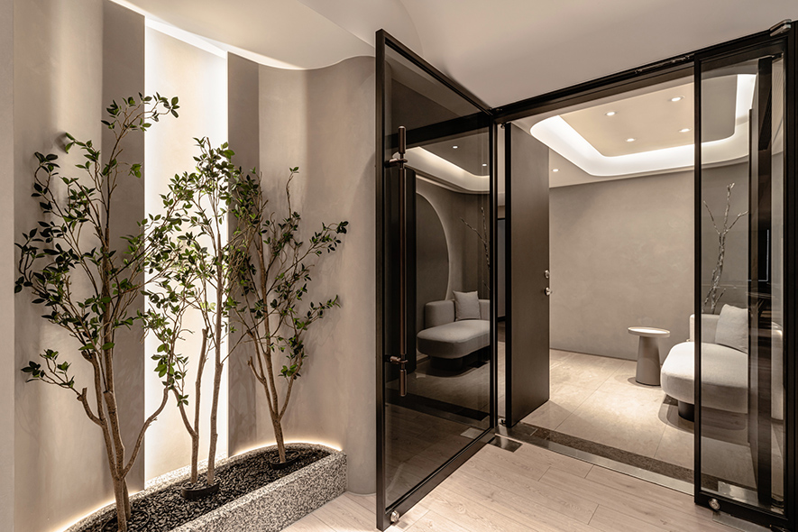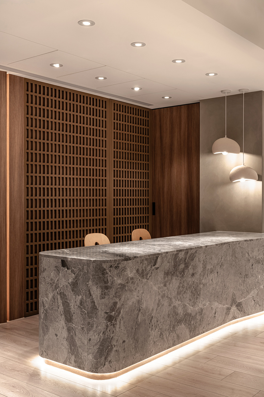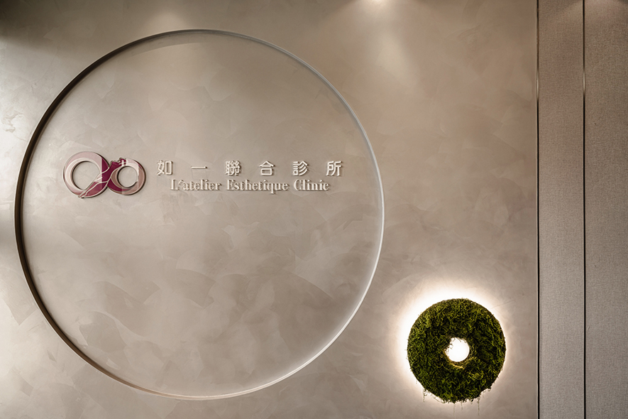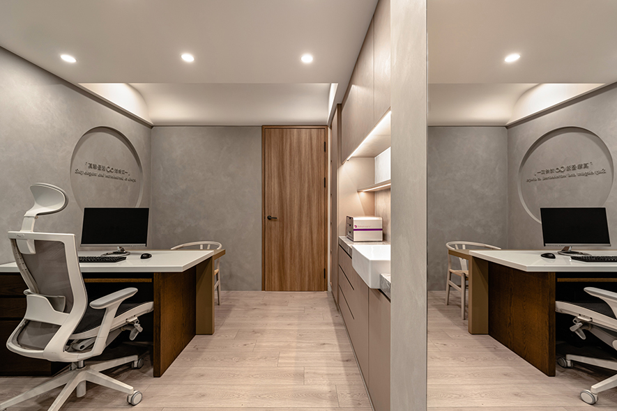呼應企業商標的圓潤造型、以及提供女性客群為主的醫美服務,設計師於多處立面、天壁匯入流線、圓弧設計,象徵女子優雅的身體曲線,並將業者「以人工美呈現自然美」的理念作為設計核心,藉由同是人為的室內裝修展現天成美感,全案鋪敘木質、大理石與仿混凝土質感的特殊塗料,輔以入口旁植栽區、走廊末端引入的天光,挹來置身戶外般的純淨自然氣息,間或點綴布藝、鍍鈦鐵件等人造材質,堆疊細處層次感同時,完美呈遞融匯品牌概念的醫療場所。