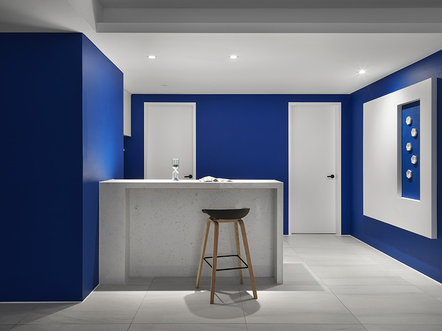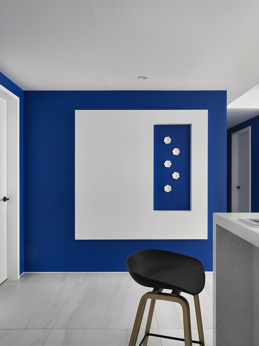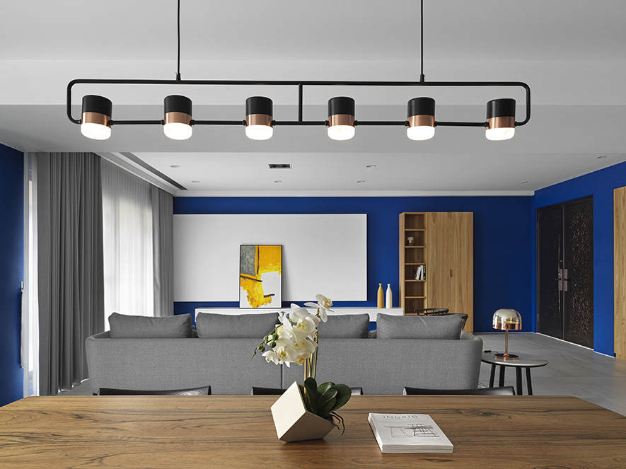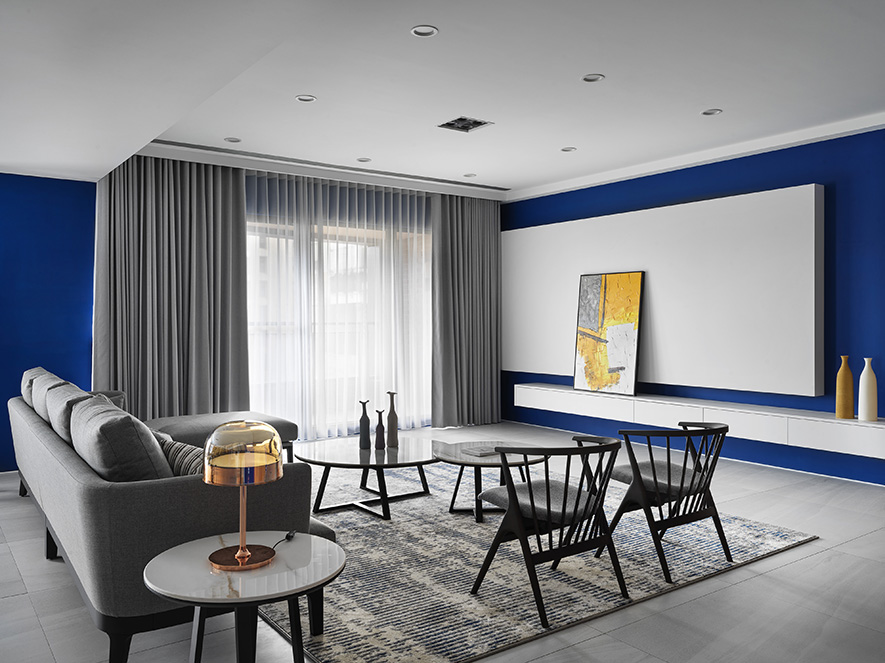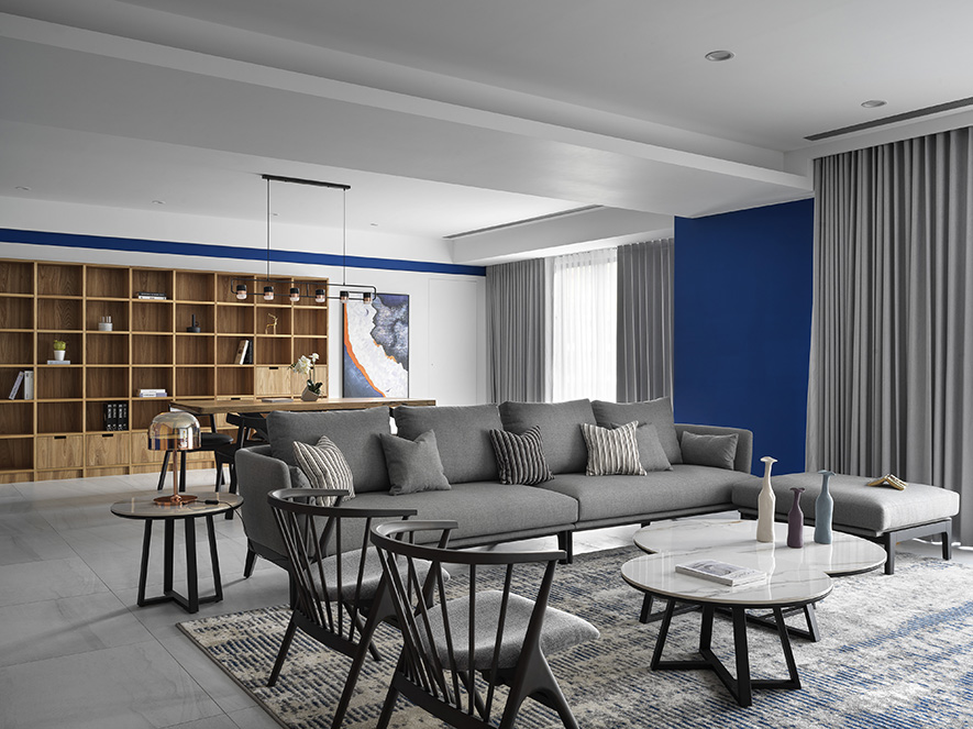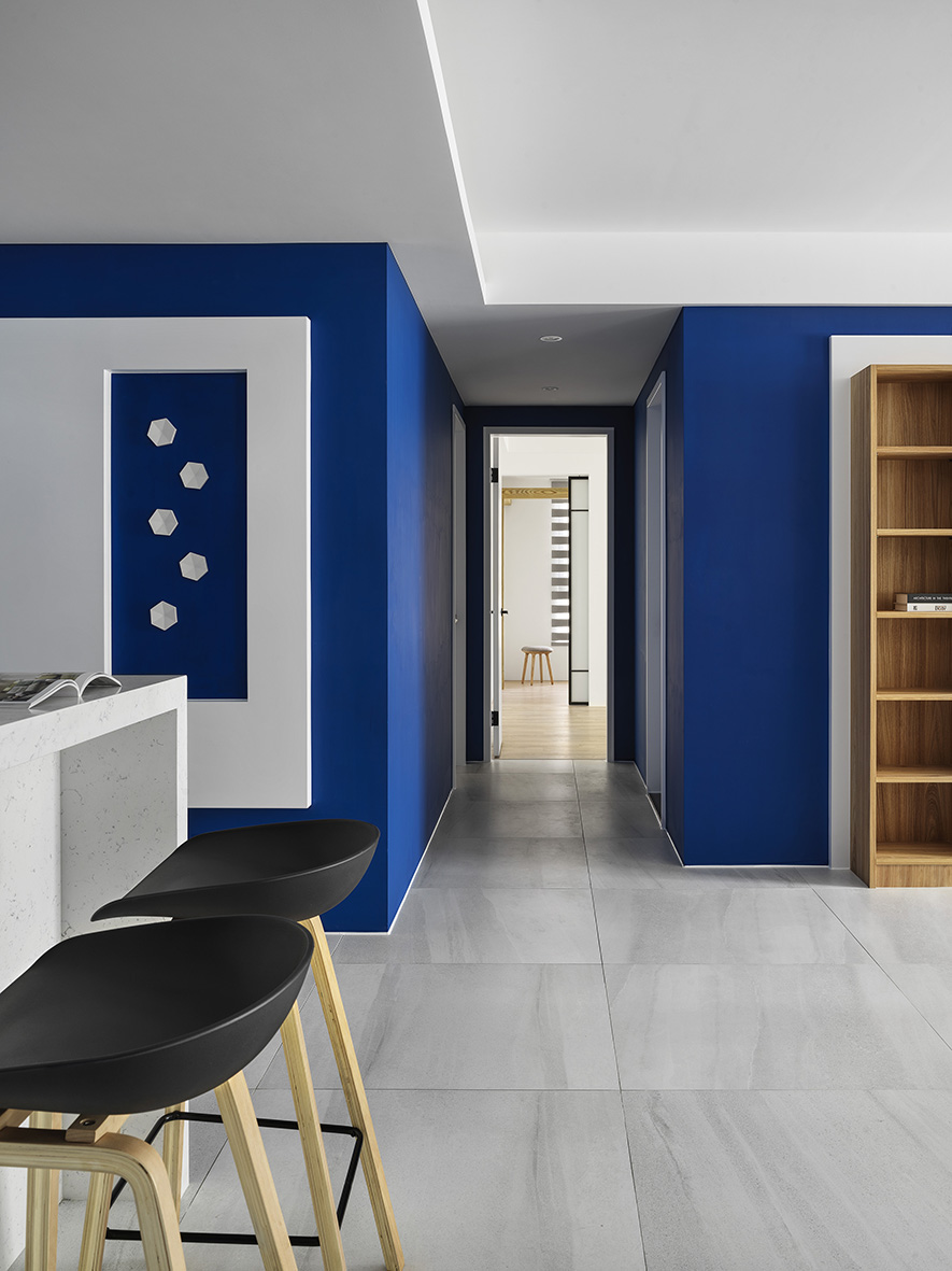 汪洋般的深藍色浸漫寬廣境地,純白與木質穿插其中,一同呈現畫面繽紛而氣氛沉穩的美麗圖景;步入其他領域,映入眼簾的是清新的淺綠、活潑的鮮黃與質樸的黑調……種種色彩紛至沓來,移步換景之間,家庭成員的鮮明性格也逐一展現。