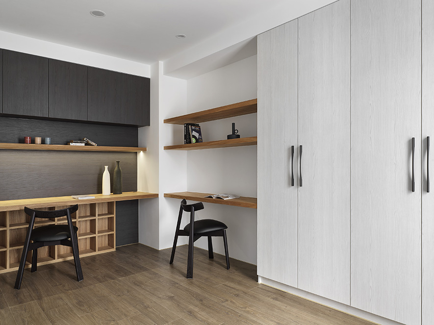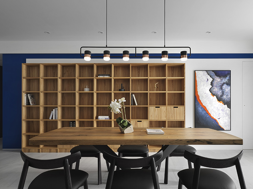 我們以個性十足的顏色為基底,加上精巧家飾和藝術畫作為點綴,打造出裝潢簡約卻不減活潑氣息的家宅。開闊的空間,給予孩子自由嬉戲的歡樂童年,而排放工整的書櫃,以及隨處皆有閱讀區的規劃,則讓一家三口遠離喧囂塵世,投入無涯書海中盡興遨遊。
