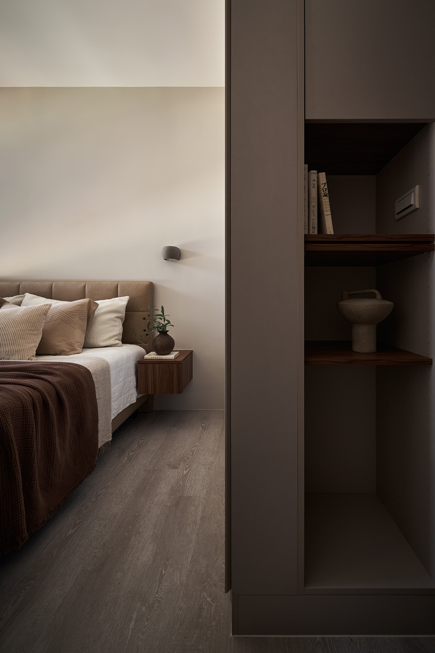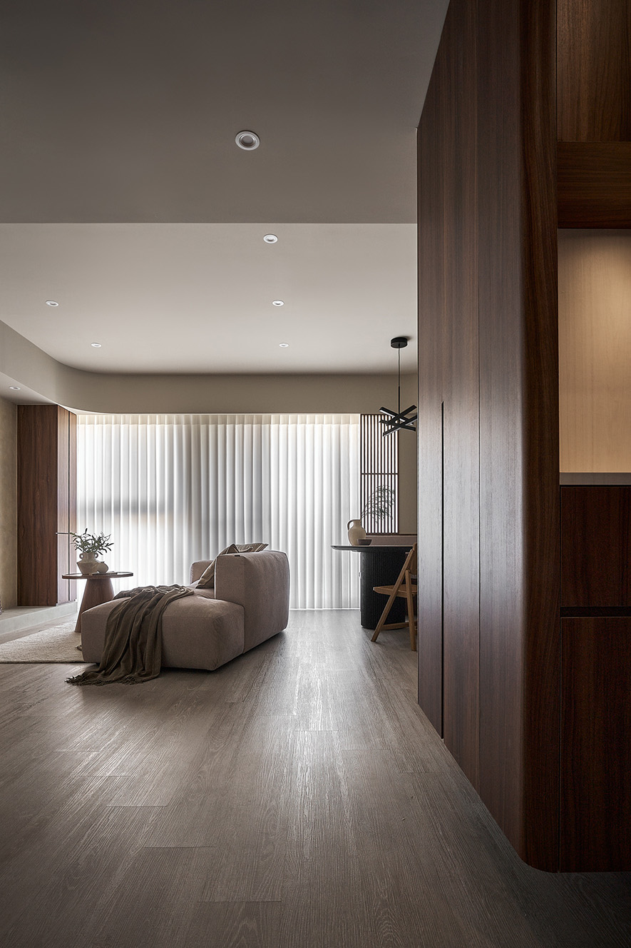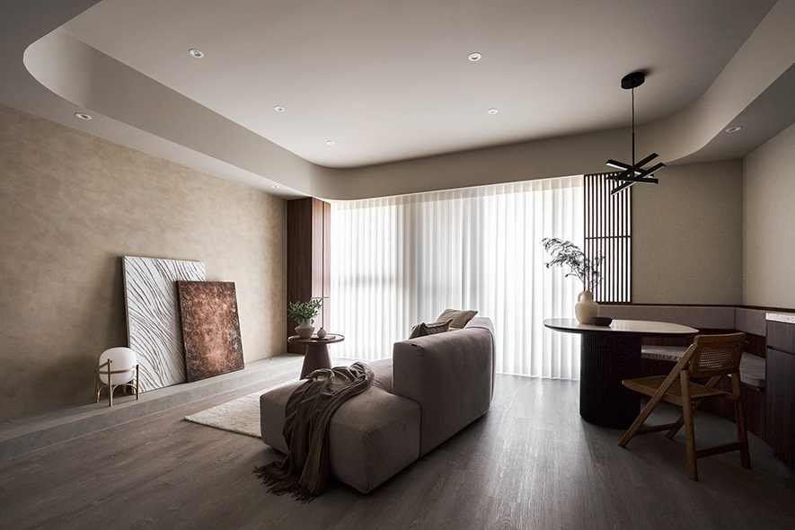 整體空間調性以暖色調為主,搭配深色木紋作為空間次要材料,