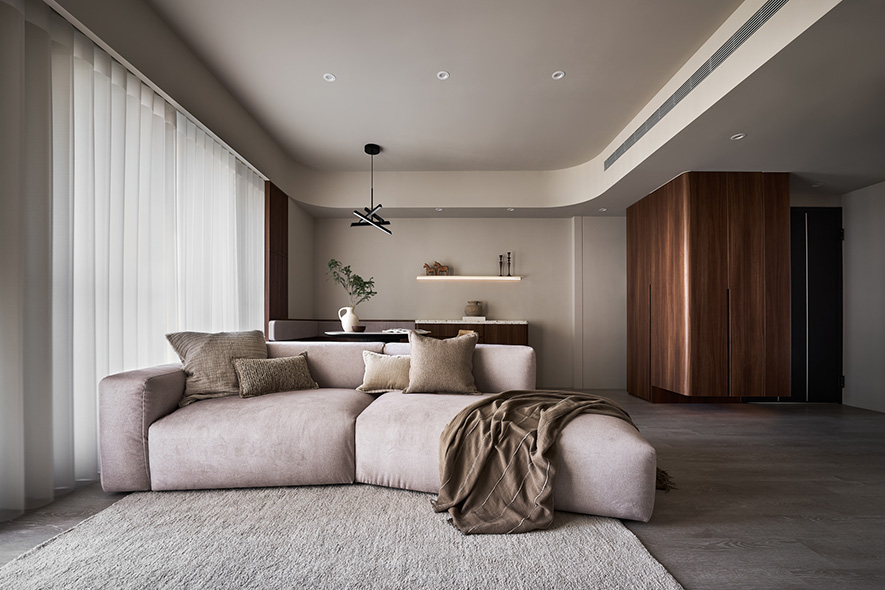 天花的圓弧元素也置入在空間中的櫃體、卡座、電視底臺,讓圓弧元素延伸至各區域中的細節處。