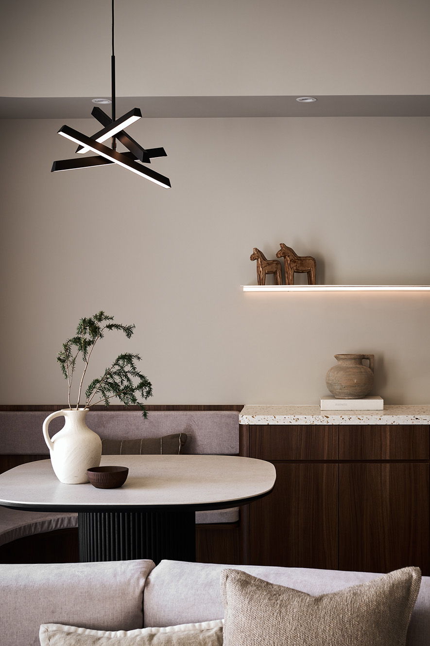 並透過間接照明、石材、鐵件來豐富空間層次,電視牆保留大面積牆面與底座使用暖、灰兩色特殊漆相互襯托,