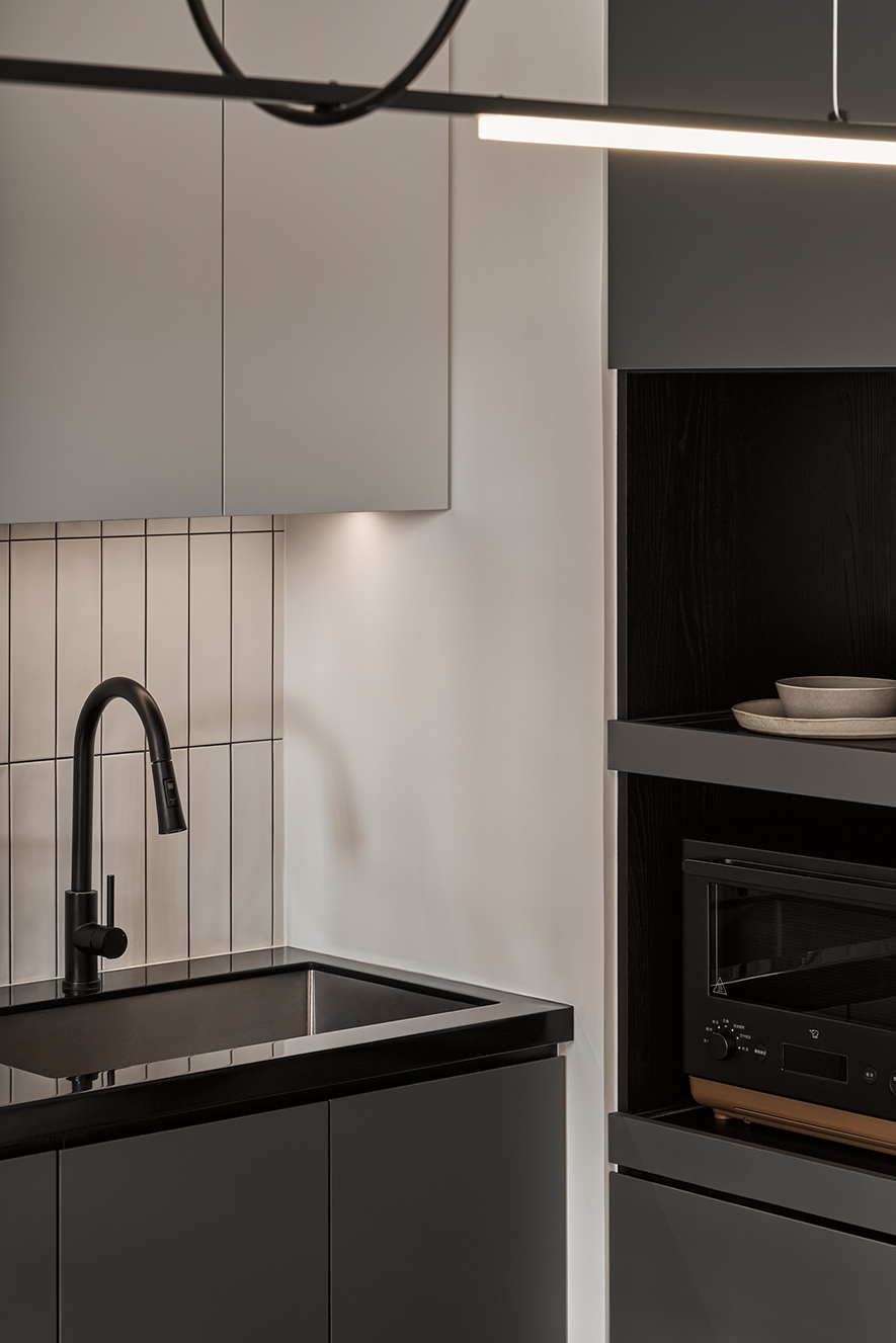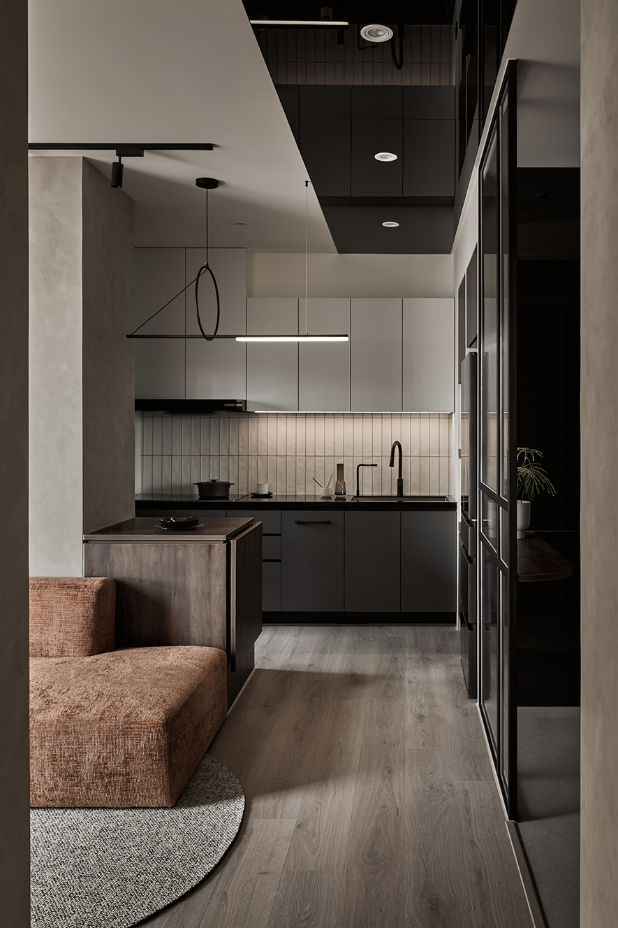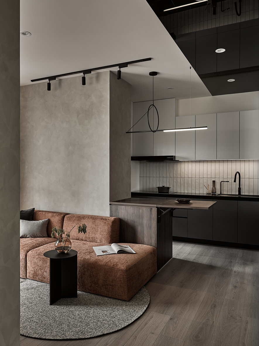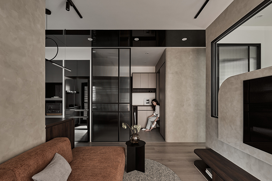 由於整體坪數有限,公共空間以開放式規劃提升使用效能。電視牆改為半高設計並結合玻璃材質,使視覺穿透、空間更顯通透;廚房區域打開為開放格局,配置中島檯面及可活動桌板,讓料理、收納與用餐更具彈性,也有效延伸空間的深度與動線流暢度。