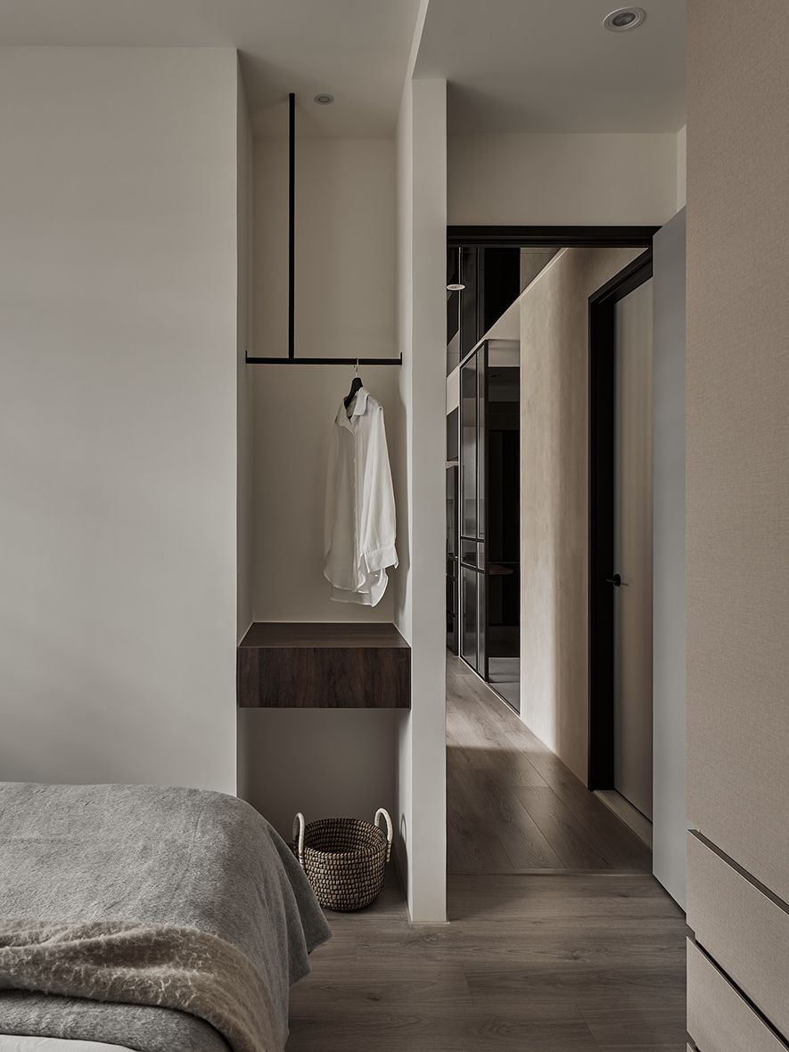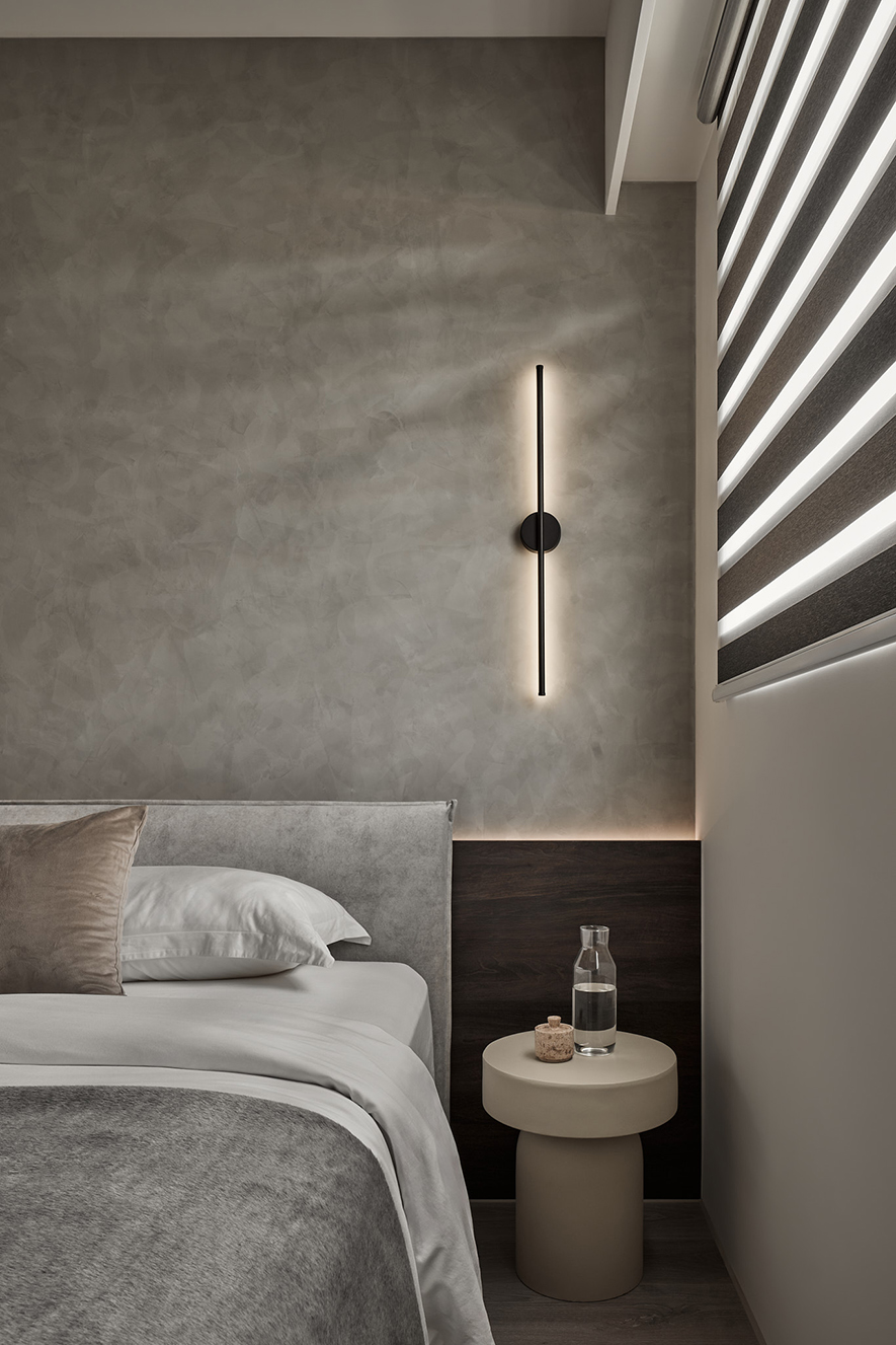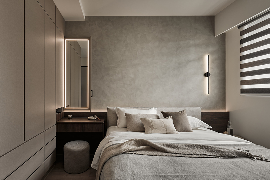 主臥室延續整體簡約風格,衣櫃內嵌隱藏式化妝鏡,使用時可拉出,不用時則完全收納於側邊,保有整潔線條。床頭板由化妝桌一路延伸至窗邊,上方牆面以特殊塗料處理,輕輕凸顯主牆質感,搭配右側壁燈,在夜晚營造出靜謐柔和的氛圍,有助於身心放鬆與入睡。