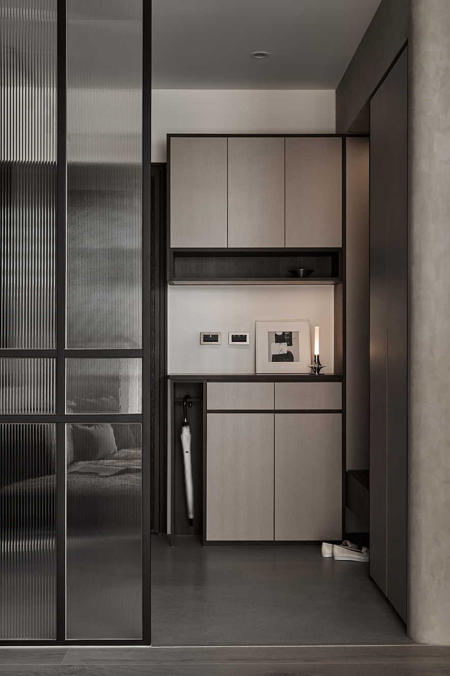 玄關區機能性強,左側整合了穿鞋椅、小物收納櫃、傘具收納、汙衣櫃與鞋櫃等多項需求,滿足日常生活的便利性;右側牆面則設置一面大面穿衣鏡,透過比例分割設計延伸屏風線條,並巧妙隱藏通往儲藏室的暗門,兼顧空間放大效果與簡約視覺美感。