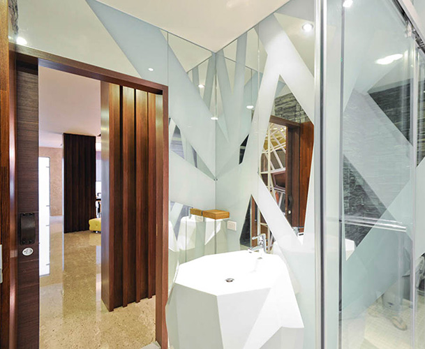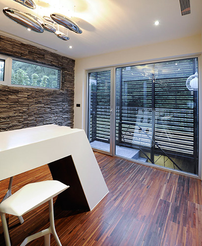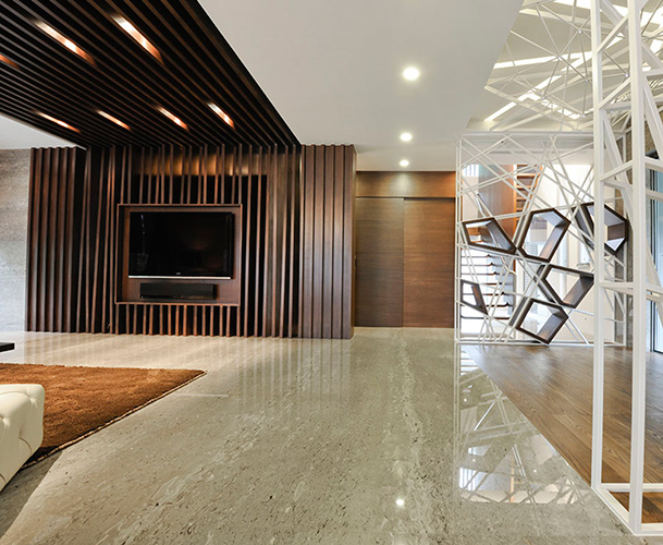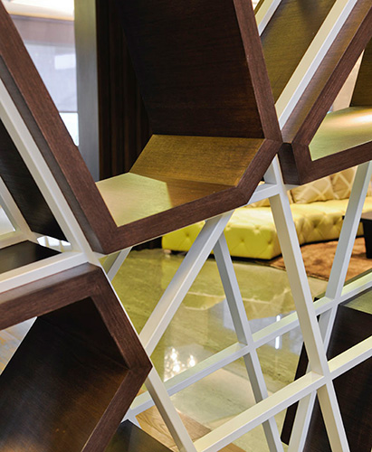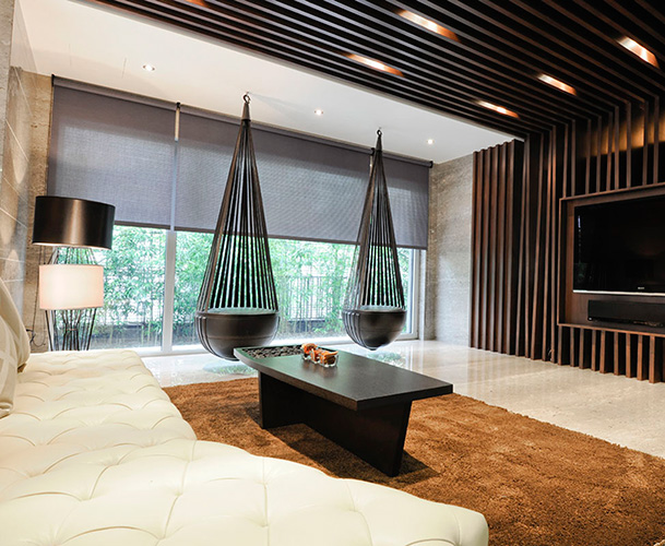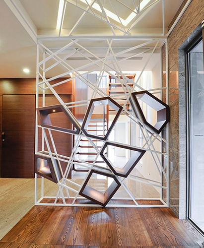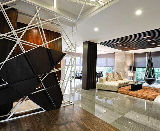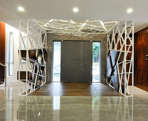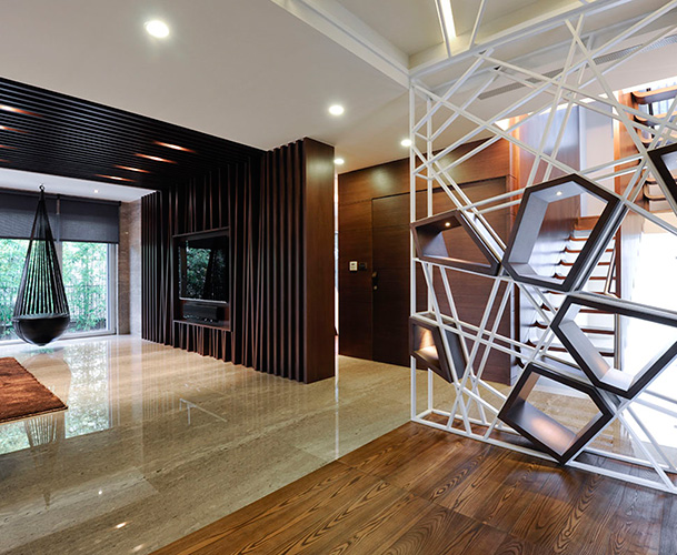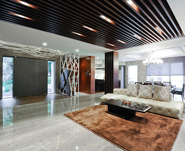 設計理念/ 內外合一的極致空間,位於新店山上的別墅,取室外的山間景致延伸至室內,光影變化的簍空趣味性,演變玄關入口的迎賓隔屏,樹枝狀的結構簡化成書架的造型不只有趣也相兼實用性,並將客戶的兒時回憶盪鞦韆結合到客廳,讓孩子童年也延續著自己的記憶。