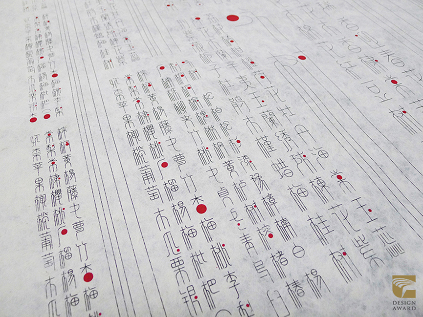 另外,視覺傳達設計作品方面,展現東方美學的精緻清雅,令人眼睛為之一亮。江蘇鳳凰科學技術出版社出版的「詠樹」,由瀚清堂設計有限公司打造視覺設計,此海報根據80多個樹種與中國傳統小篆體結合設計,創造獨特的樹篆體。江蘇鳳凰美術出版社出版的「學而不厭」,由曲閔民&蔣茜設計,書本以中式排版由左往右翻閱,文字採用豎排版,高低不規則,產生優美的韻律感。內文透過反覆用黑白書法進行書寫,表達出作者所想傳遞「學習是一種反復的堅持過程,沒有終點。」