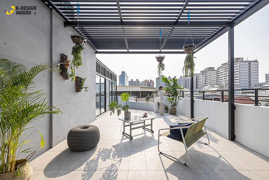 ▲頂樓搭建玻璃屋,以滿足女主人晾曬衣物,不必顧忌天候的心願,並在屋外構築鋁合金格柵遮蔭,與綠植、閒適桌椅相伴,化作一幅悠然景象。