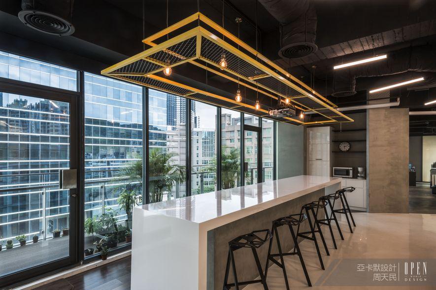 除了辦公區,當然少不了員工的放鬆空間,白色的吧台與黑色高腳椅帶出空間的時尚氛圍,裸露的天花板和網狀線條的燈飾延續工業風格的簡潔大氣,大片落地窗外有著綠色植物的妝點,每到休息時間便能三五成群的走到陽台聊天散心,讓工作壓力瞬間拋到九霄雲外。