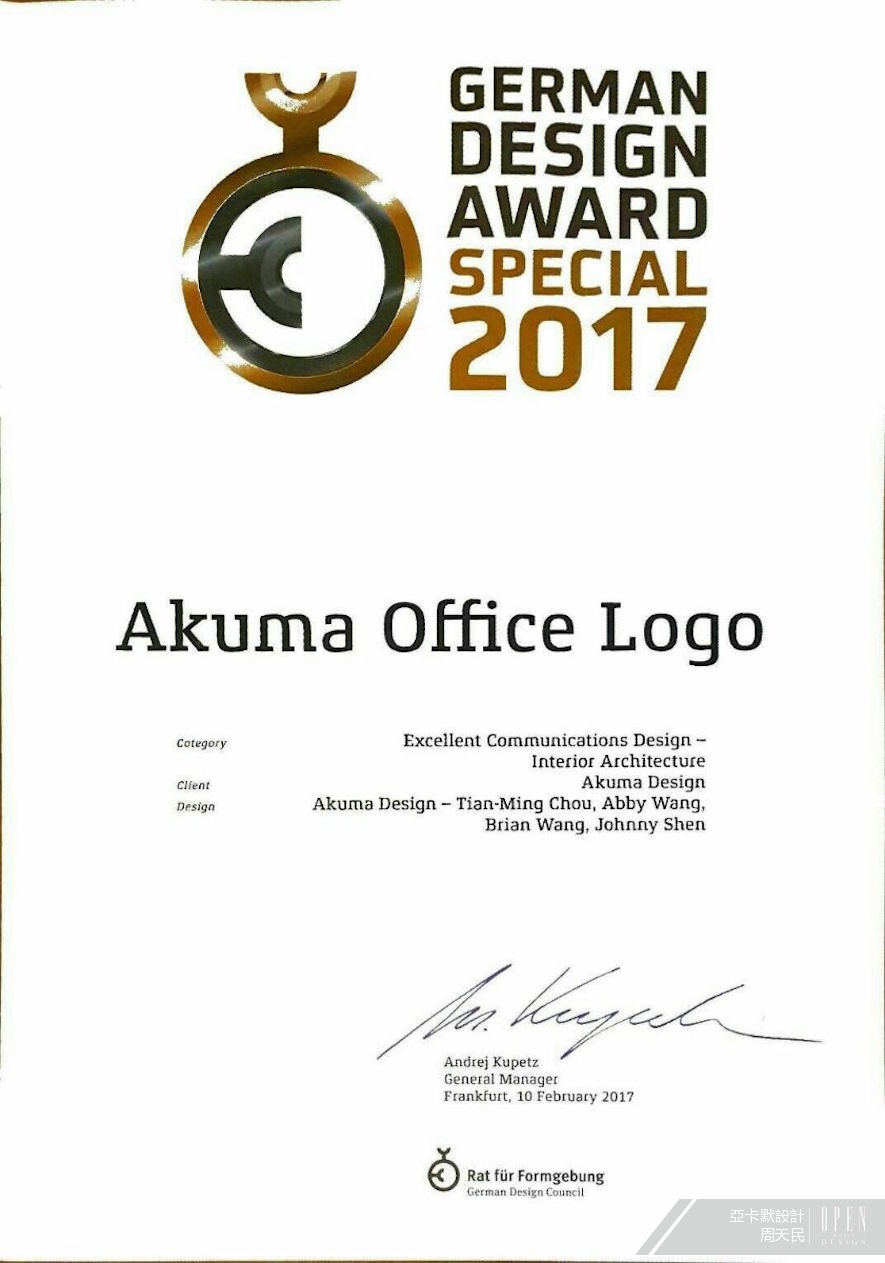 2017German Design Award是德國官方位階最高的設計獎項,因為歷史悠久加上高度影響力,所以在設計圈裡廣為盛傳,每年都會吸引眾多設計師報名參賽,被譽為設計行業中的「獎中獎」。亞卡默設計 周天民 設計總監繼2016德國iF設計大獎之後,再次以相同作品《Akuma Office Logo》 榮獲2017German Design Award,創新的設計巧思讓人見識到設計師的深厚功力,實至名歸。