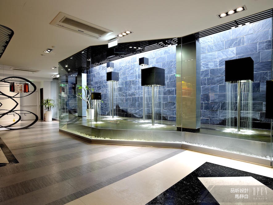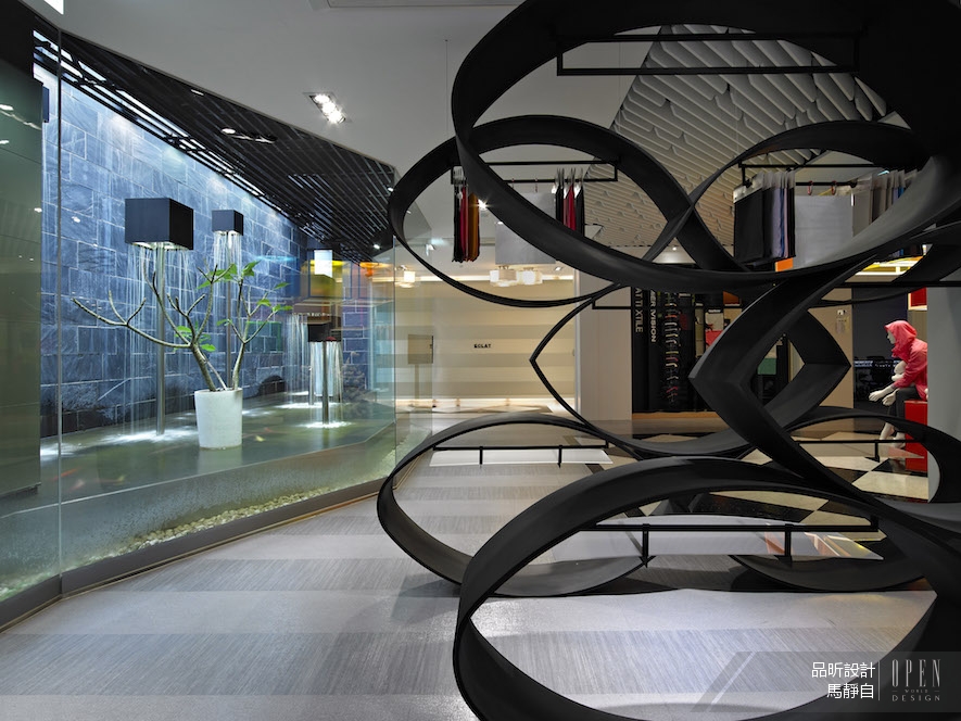 注入一曲流觴,將紡織業不可或缺的水資源帶入設計概念中,所帶來的是清新開闊的視覺意象;交織複雜的線條,纏繞的是代代紡織者那溫柔簡單的美好,寧靜安詳的氛圍,憑藉著水流與織線,緩緩地流入人們的心中,流到最初紡織機軋軋相間、孩子們嬉戲笑鬧的古樸時代。