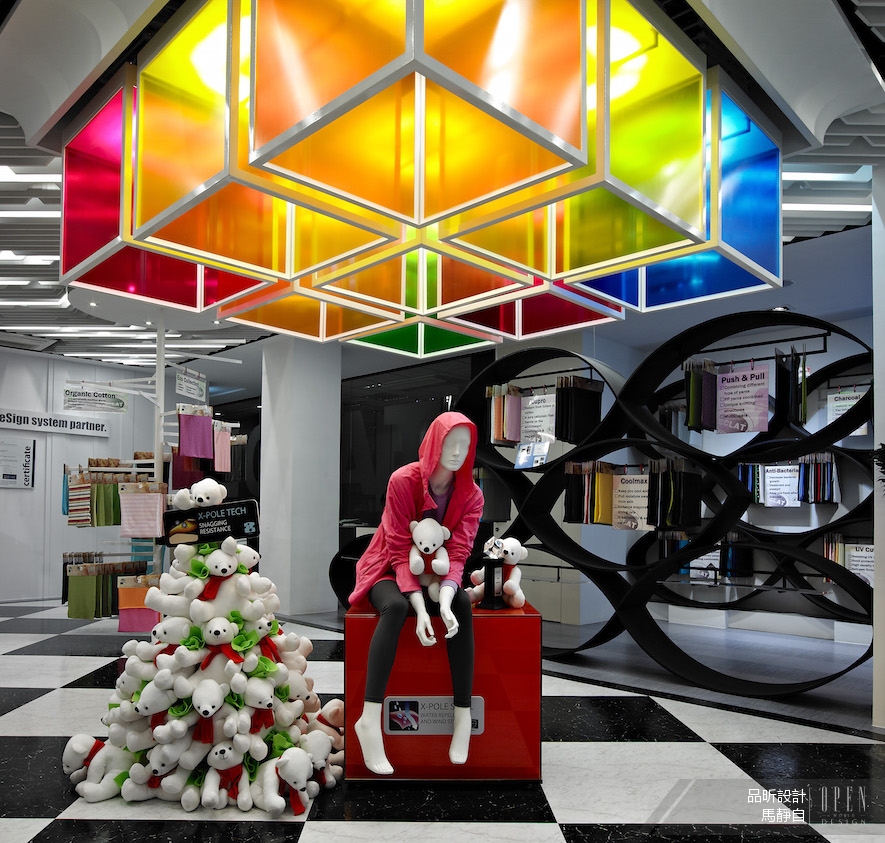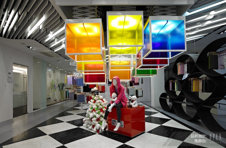 從上垂降的半透明色彩壓克力櫃體,藉由機器的升降與光源的照射,透露出繽紛且柔和的色蘊,宛如紡織般針針密密的細膩手法,任何角度皆是風景,每一面相皆是藝術,讓人忍不住駐留欣賞,難以離去。這樣的垂吊藝術,是設計師在光與色之中玩出的一場空間與視覺的完美饗宴。