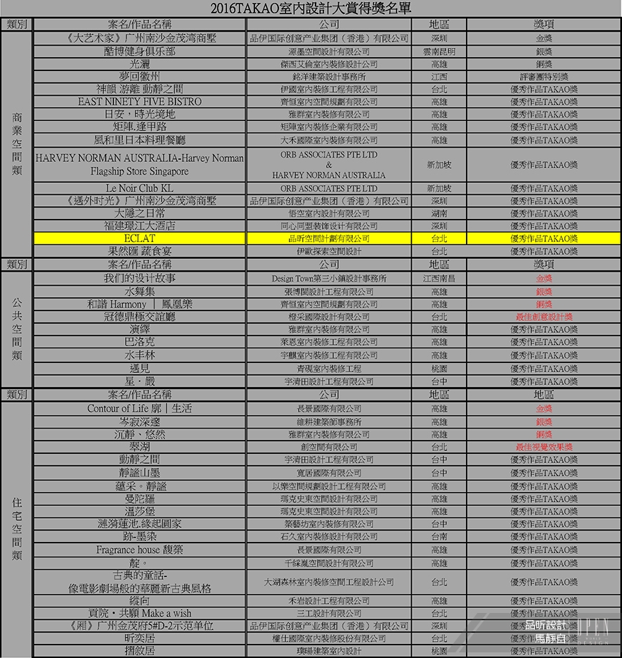 TAKAO室內設計大賞為高雄高雄市室內設計裝修商業同業公會精心展出的活動,以凝聚當代設計師的創意思維,推動空間與視覺上的文化品質。在眾多菁英的競爭下,品昕設計 馬靜自設計總監從中脫穎而出,以ECLAT系列作品,打破跨產業間的隔閡,連結紡織業的柔美意象,榮獲優秀作品TAKAO獎。