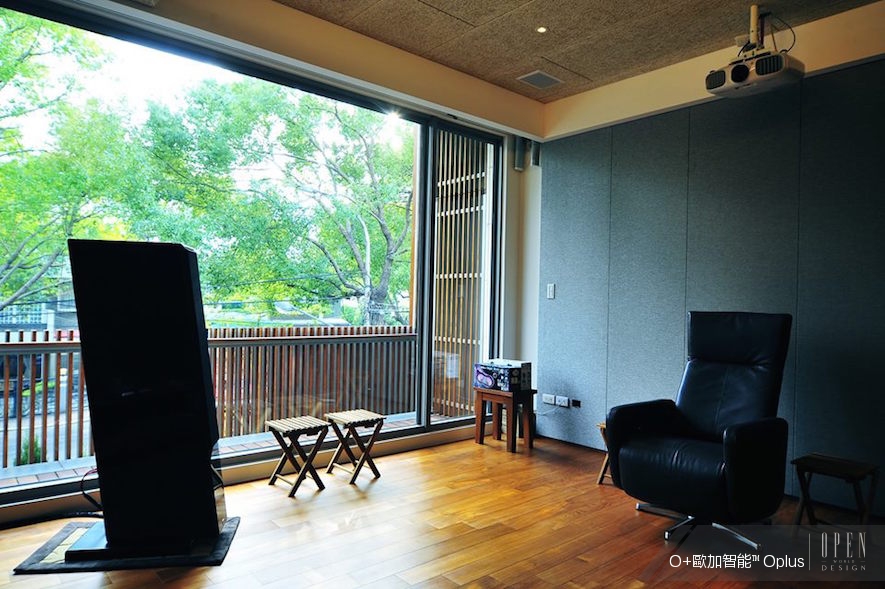 窗外的綠意與室內的智慧空間相互呼應,使我們在樸實與科技間自由穿梭,兩者的對比在無形中成就一種和諧的衝突美。在視聽室裡,O+歐加智能™ Oplus也替屋主規劃劇院模式的情境應用,只需按下一個鍵,在窗簾拉上的同時,投影機、音響和擴大機等視聽設備開啟也一次到位,享受流動在空間中的美好時刻;結束後,再按下全關鍵,設備將會回歸到最初狀態。