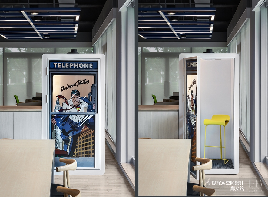 現代時尚的燈管以不同造型分開會客與辦公區域,具有穿透性的玻璃門減少視野阻隔感,並貼上標語貼紙為室內注入輕鬆有趣的氣息;一旁電話亭造型的隱私區域貼心的在其中設立座位,讓私人通話不用再低聲細語。內部辦公空間劃分成討論區與個人座位區,開放式的空間讓員工能隨時討論分享以提升工作效率,也打破以往主管與員工的距離感為團隊加入活力能量。