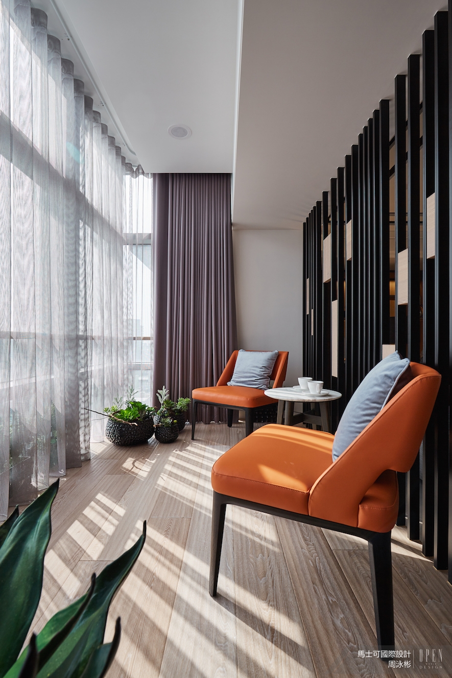 向著和煦陽光拾階而上,輕軟薄透的紗簾替室內陽台披上一層柔柔的情意,同時替流連此處的訪客篩去熱度;僅放行暖意光線穿過簾子,優雅地灑落於溫潤質樸的木地板。兩旁隨意置放的盆栽,增添自然綠意,令人感到神清氣爽;而悠閒愜意的休憩時光中,最為醒目的便是兩張鮮橘可愛的單椅;寬敞的椅面及背靠,使人在慵懶的環境中,得以擁有從容翻覽書報,或閉目養神的小小天地。