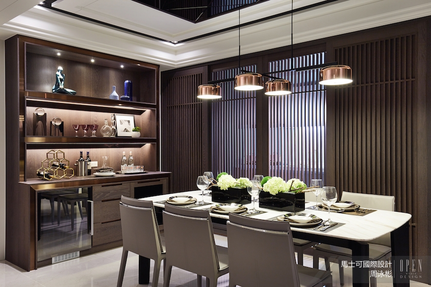 位於客廳一側的餐廚區,其深沉安定的空間構成,和輕鬆寫意的休憩區形成相映相襯的場域對比。木製格柵拉門將餐廳、廚房劃分開來,既賦予各空間的獨立性,亦可通過格柵隱約看見彼此的身影,保有內外場域的互動機能。餐桌上方的四盞玫瑰金燈飾,省去繁複構造僅以黑色鐵線平衡吊掛,釋出金屬物件獨有的現代風尚;配上暖黃光源,恰好軟化原有的冰冷質感,給予餐食區域飽滿厚實的溫度。而後方餐櫃選用鍍鈦板鑲邊,低調拉出當代特有的奢華線條,幾盞酒器、玻璃物件陳列其中,更顯屋主的不凡品味與空間氣韻。