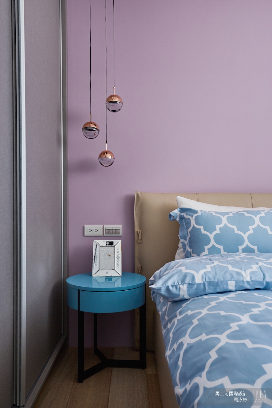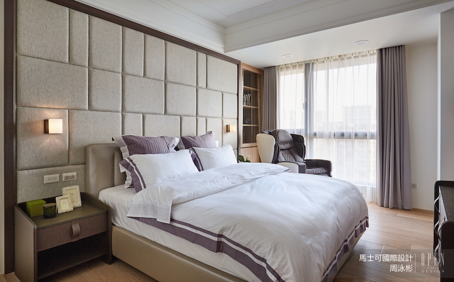 主臥室透過溫柔語彙,對簡約優雅風格逕行浪漫傾訴;天絲滑順的觸感和細緻的光澤,透過一席白紫相間的清雅寢具,創造安心舒眠的臥室印象。床頭背板的簡單格狀繃布,鑲上擁有暈黃光線的小夜燈;不但有助於睡眠,更在方格造型上統一了整體視覺,體現設計師於細節處的微妙處理。