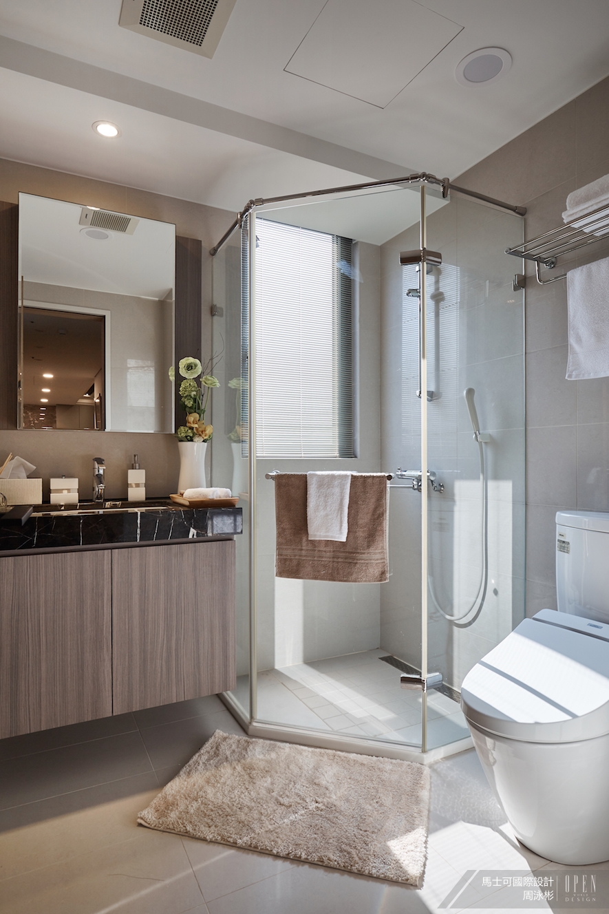走道一端的主衛浴採用乳白色基底,輔以通風採光良好的窗戶及通透玻璃,打造清爽潔淨的視覺空間;而一旁擁有平順紋路的原木櫃體,嵌上黑色大理石檯面,在一片純白飄然氛圍中,注入一股穩定氣息。在黑與白的互相對話中,物件彼此有了分明的存在感,分別得躍居主角地位,不再只是場域間的客體。