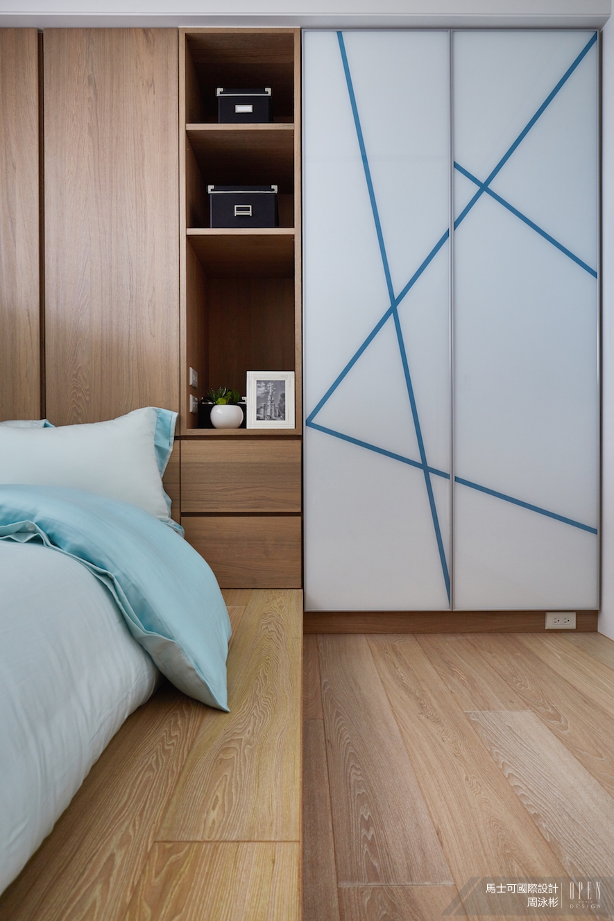 兩間次臥同樣以手刮地板呈現舊時痕跡,讓溫潤的木質觸感烘托出悠遠的歲月餘溫。向上延伸的木作收納櫃,撥出部分櫃體創造開放的展示機能,其餘則以光滑木紋肌理門片安定空間形象;藍白花紋線條交錯於兩間臥室的寢具及衣櫃門板,則呼應前廳中色彩跳脫的搭配手法,讓原先靜謐溫馨的臥房,散發活潑的光彩。