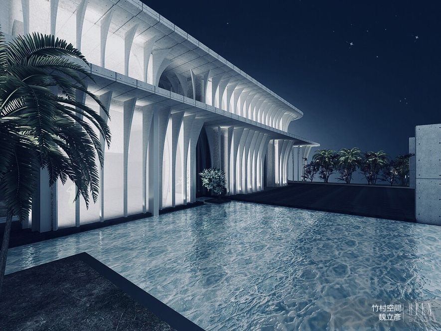 配合業主經營上的考量及整體協調性,設計師沒有規劃對外陽台,而是將每個房間做出獨立的天井,滿足旅客對於通風、採光及造景的需求。為了追求齊整和諧的審美,外觀採取大片的落地窗迎接朝曦、暮靄、粼粼波光與成片的綠意;而夜晚亮起廳內主燈後,外觀更像是個靈動透澈的琉璃屋,與之延伸的白色枝幹,便一同幻化為遺世而獨立的風景。