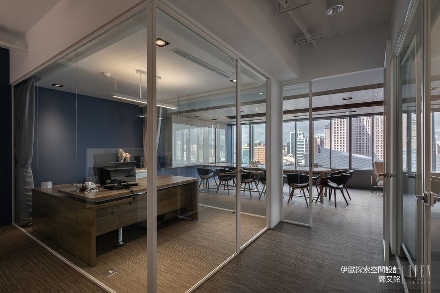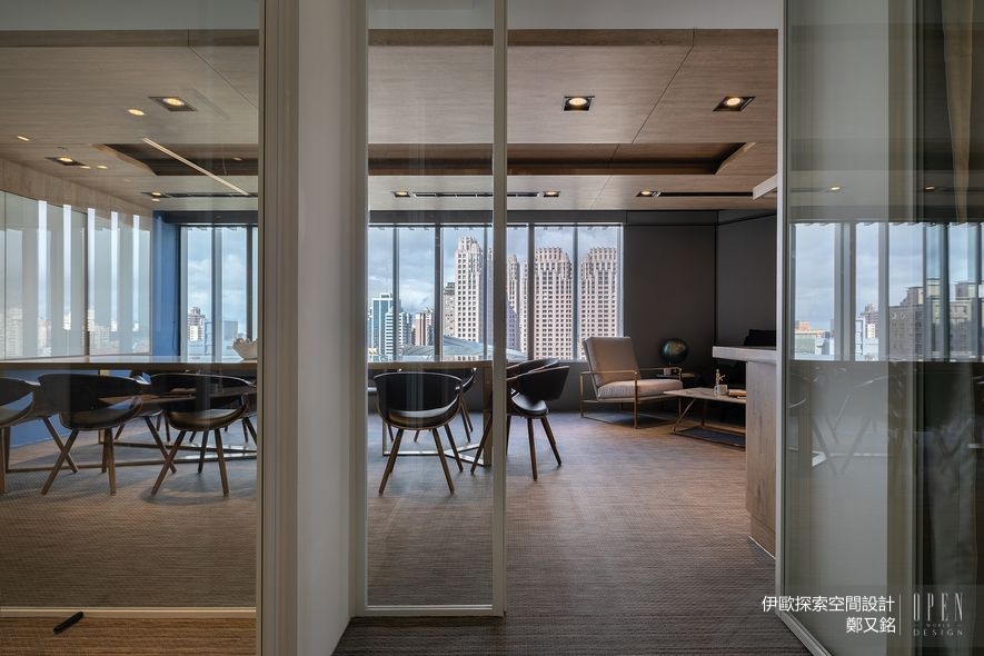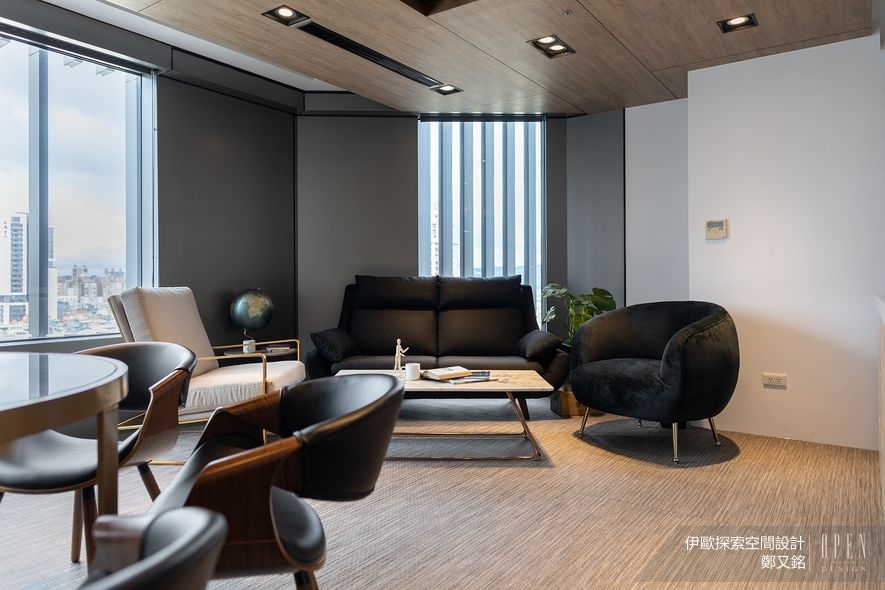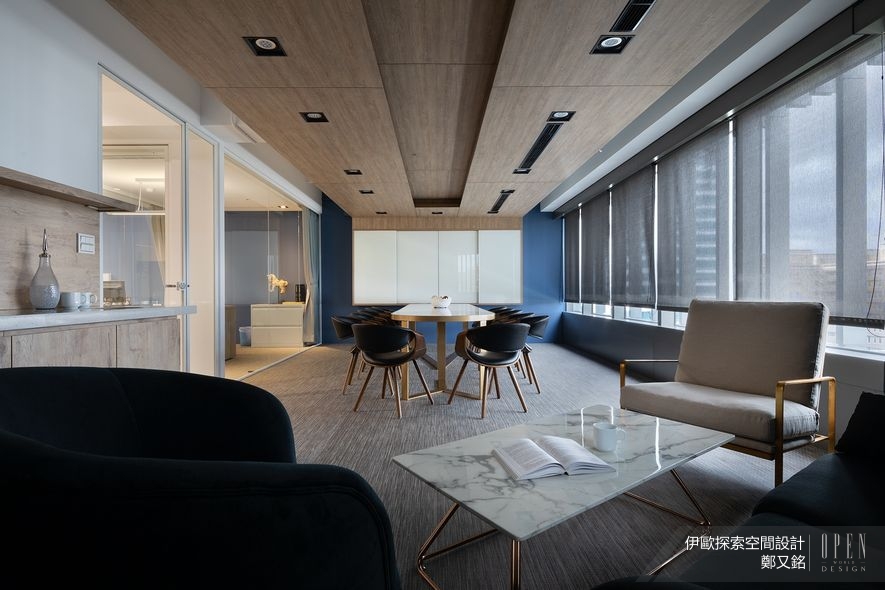 踏著木質調鋪展的路徑來到會議空間,綿密窗光開啟都市風景,每日將巨型網絡充沛的熱力電流傳導心中;覆以濃郁木色天幕形成的穩定邊界,延伸出兩側簡潔牆面,以藍、灰、白三色俐落表現休憩氛圍,有效散逸會議過程中頭腦過度運轉的熱能。另外,安踞一隅的洽談區承襲整體印象,將沉穩意蘊濃縮於質感軟件,簡單而永恆的黑白配色回應優雅灰牆漆,使主客談話能於理性色度及陽光窗景間順利運行。