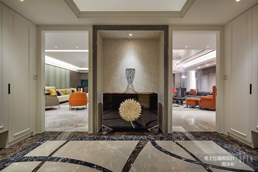 「就像繪畫分為兩種,抽象和具體,我希望我們做的是前者。」馬士可設計擅長運用抽象隱喻鋪敘空間故事,以《花開富貴》和《藍鵲歸巢》這對母女作為例——前作屋主是位年屆八旬的奶奶,年輕時辛勤耕耘企業,並細心教養子女成長,如今穩定成長的生意由女兒接手。圓滿的事業與家庭經營,予人牡丹花般生命堅忍和氣質富足的聯想,周總監遂以此設計空間,選用花型軟件、家飾點綴,於晶亮石材中形塑家居的高貴氣質。