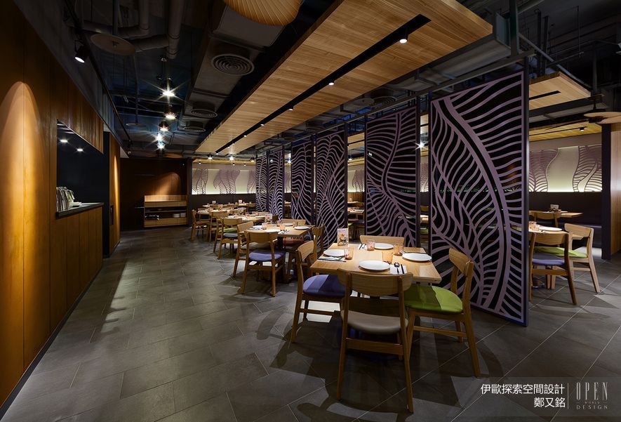 「饗泰多」是一間新泰式風味料理的主題餐廳,餐廳入口的木質感牆面上,以幾何圖塊拼出泰國吉祥動物「大象」的形狀,展現迎接賓客的誠摯熱情與濃厚異國風味。設計團隊將芭蕉葉紋路化為抽象圖框,染上木槿紫色調,為餐廳置入視覺重心;明亮壁面周圍在芭蕉葉紋理的襯托下滲出光暈,與另一側黑玻所在空間之中相互疊加,光影的變化與通透的場域轉換,為空間蒙上一層撩人的神秘色彩,彷彿跟隨設計師的步伐,走進變幻莫測的熱帶雨林。