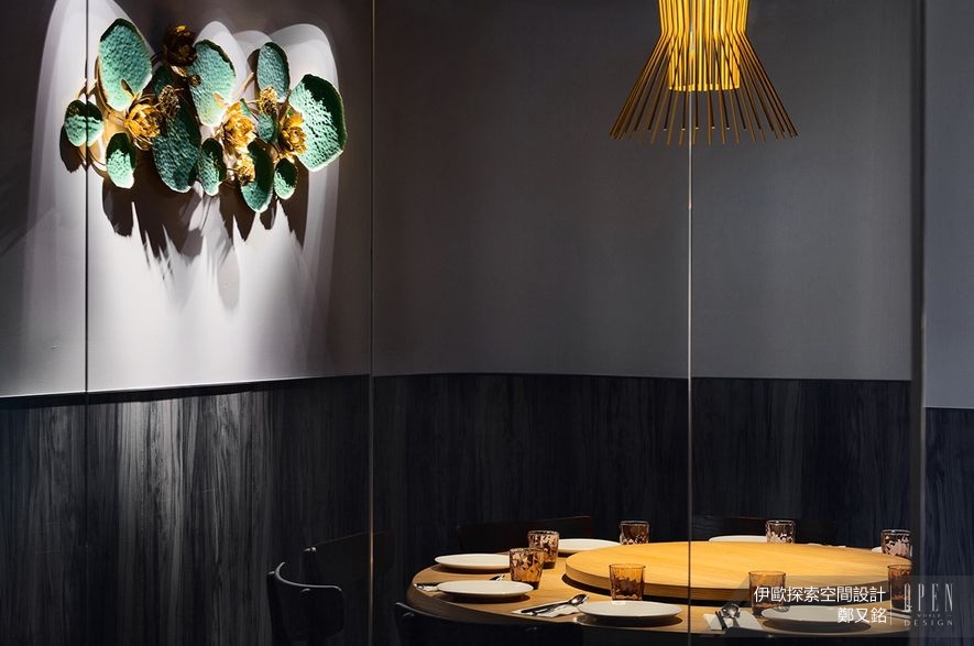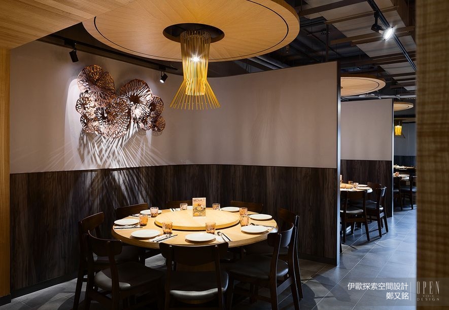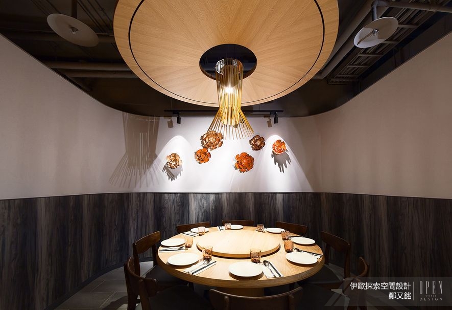 半開放式的包廂亦如一座座泰國傳統木造屋,天花垂釣著金屬仿藤條質感的造型燈具,牆面上刻畫著富有溫度的白栓木紋,一朵朵金屬花卉茂盛叢生,鏽化的壁面如同訴說著叢林中那古老的故事。伊歐探索空間設計團隊透過設計,描摹出神秘而富滿生命力的異國風情,一踏進此一空間,便如同進入不同的時空,當異國料理上桌,即刻燃起味蕾的慾望,一場泰式盛宴亦大肆展開。