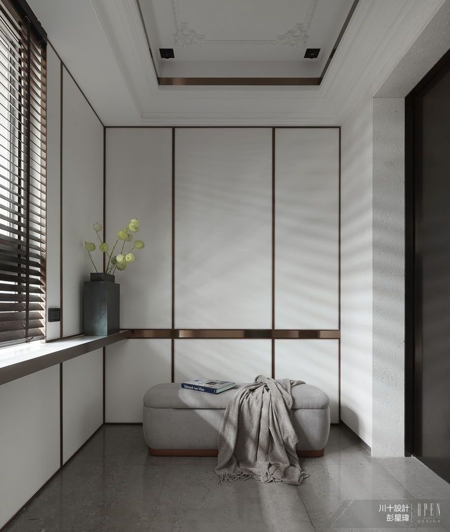 玄關天花板取樣自古典線板意象,層次遞進至金屬邊條與圖飾線板,形成類似穹頂的天幕樣式;另以鍍鈦為軸線,於立面拉伸出框格,形塑質感金屬與潔白立面的沉穩對話,讓一日的毛躁於此靜靜緩和。