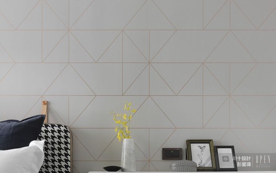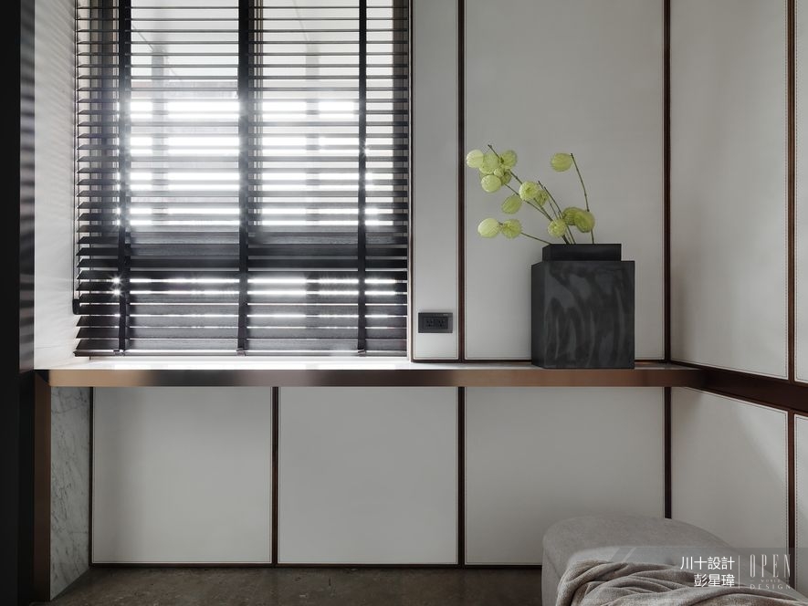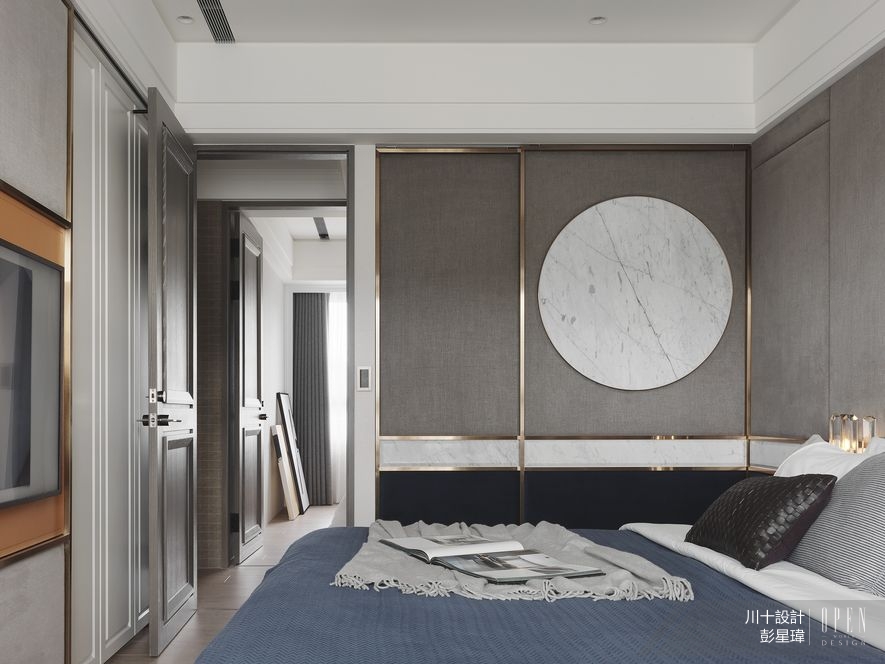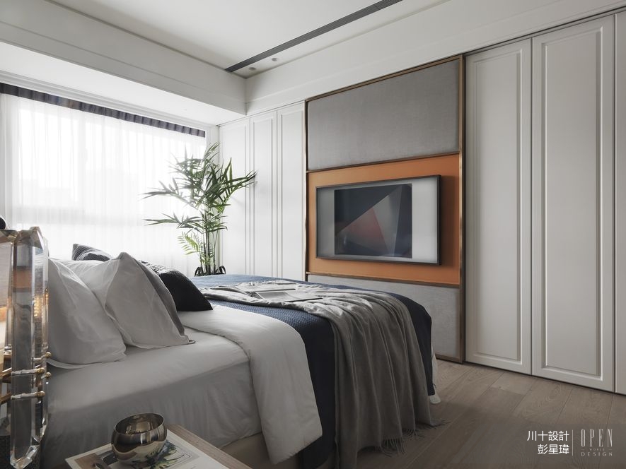 受公領域的寧靜氛圍簇擁來到主臥室,「方」與「圓」的空間語彙變得更加鮮明——設計師轉化現代簡約線條,以金屬邊飾強化場域的縱橫感,並同時作為接合異材質的過渡媒介,將立面當作畫布挑戰多樣化的色澤搭配。如電視牆以白色直立線板配合灰色塊狀繃布為周,暗橘色區塊為心,自然地引領視覺聚焦中央;一方面凸顯牆面主要機能,更於過程中構成一幅靜謐畫面,使人於氤氳滿室的沉靜氛圍中悄然入眠。