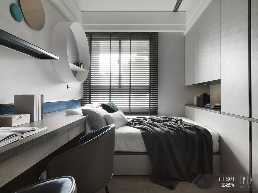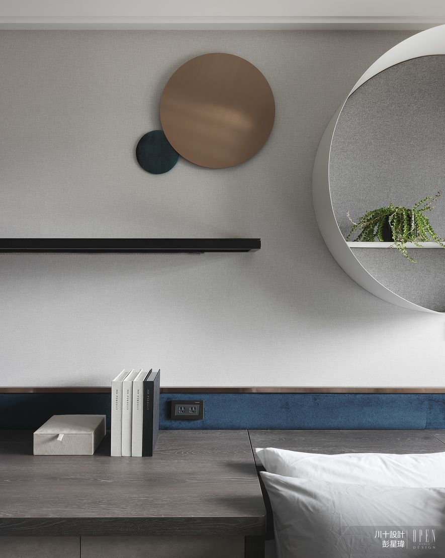 次臥房轉而將圓形意象化為機能置物架,設計師於床頭主牆規劃醒目的圓架及壁飾,將「圓」所具備的圓融完滿之氣暈散開來,突出的造型亦豐富了狹長場域的視覺動線。自書桌延展而來的床頭櫃,運用俐落的組合式設計,平順地承攬視線向外延伸,同時提供充分的置物區域;而對側壁櫃則配合床鋪高度,於順手處設置內嵌置物台,滿足順暢拿取物品的日常需求,使私人領域於簡單而美的機能語彙中達致完備。
