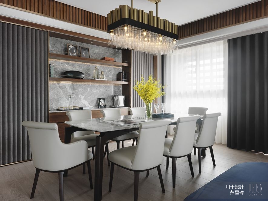 行至用餐區域,低調閃爍的造型燈具開啟場域的新奇想像,上端略具仿舊感的圓柱體連接下方透明材質包覆的球體燈泡,集合工業裸空及古典華麗元素而成;細膩地將光澤撒上白石桌板與皮革單椅,替冷色調軟件暖座升溫,微塑家人用餐時的溫暖時光。屹立一側的開放式壁櫃,則汲取天頂木質混合餐桌石板兩種元素,框構出櫃體骨架,並採擷吊燈的光芒意象,發展為層架後方的間接燈源,共構餐飲時光中的美麗風景。